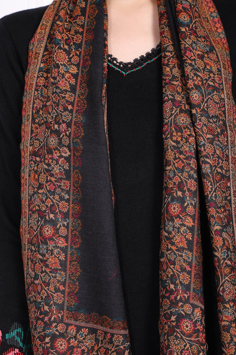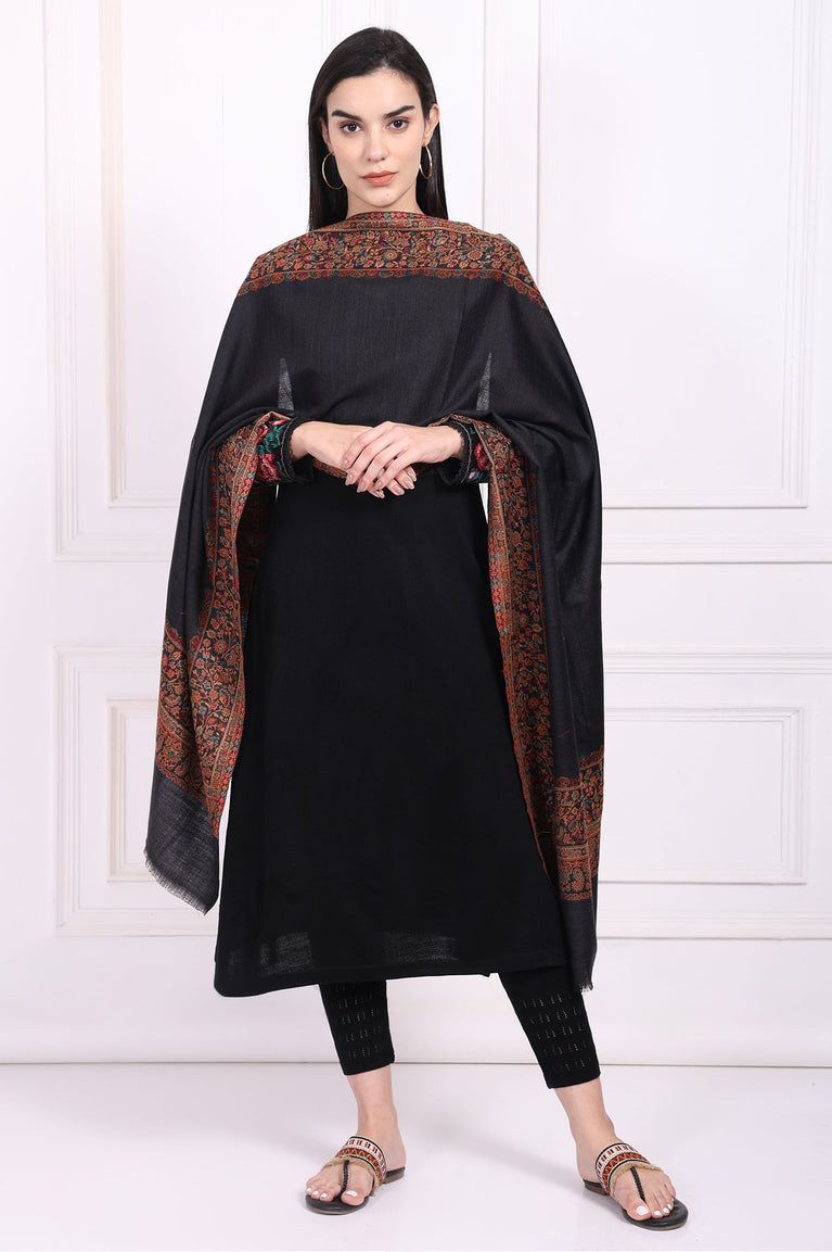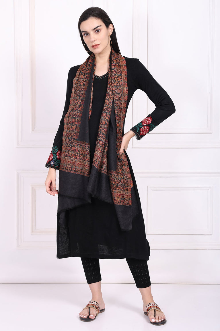 A whisper of heritage for the modern wardrobe, this stunning black shawl for women is a true masterpiece of textile art. Imagine wrapping yourself in its luxurious warmth; it’s crafted from a soft wool blend that feels beautiful against the skin while draping with an elegant, fluid grace that complements any silhouette. This designer stole is generously sized at 2 meters in length and 70 centimeters in width, offering versatile styling options and graceful, opaque coverage. Its real soul, however, is woven into the magnificent borders. Here, an intricate, yarn-dyed paisley and floral jaal design unfolds in a symphony of rich crimson, deep emerald, and muted gold tones, creating a vibrant contrast against the classic black field. This ethnic wrap showcases exceptional woven artistry, with a subtle sheen in its threads that suggests delicate Zari work, catching the light with every movement. The shawl is completed with classic, soft fringes that add a touch of traditional charm. It’s the perfect companion for festive soirées, formal dinners, or a winter wedding celebration. More than just an accessory, it's a statement of timeless style and exquisite craftsmanship you’ll reach for again and again.