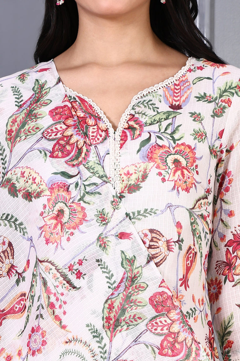 Off White Floral Printed Kota Straight Kurta, Pants and Dupatta Set