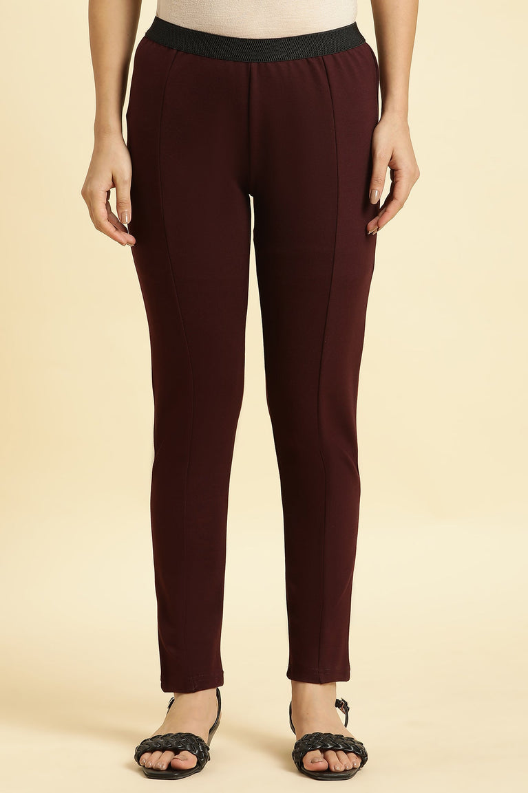 Tailored for effortless comfort, these slim-fit leggings for women in Wine exude casual elegance. Designed with a mid-rise waistband, the straight-leg silhouette offers a flattering fit that moves with you. Crafted from soft rayon fabric, these leggings feature a smooth flat front style and a stretchable knitted texture for all-day ease. Perfect for casual outings, travel, or workout sessions, the ankle-length hem adds a touch of modernity. Pair them with a tank top or a kurta for versatile styling options.
