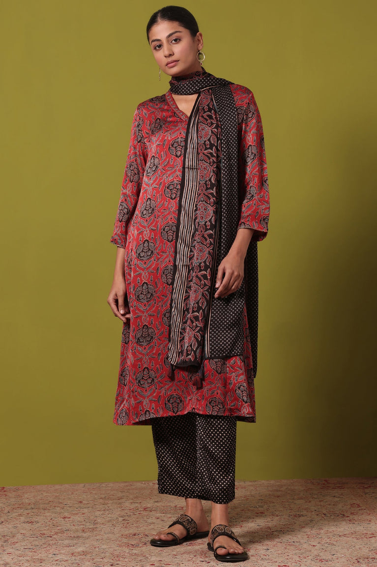 A Straight Kurta In Cotton Silk Features Geometric Zari Embroidery On The Front Panel And Lined With Soft Voile. Sleeves Are Accentuated With Stripes In The Facing And Bead Detail.