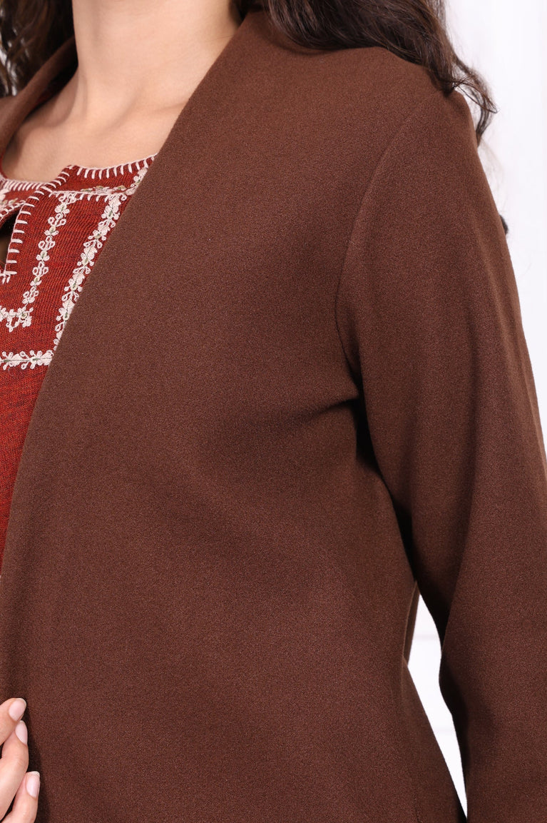 Chic and versatile, this brown solid straight coat for women is a winter wardrobe essential. The collarless design and embroidered sleeves add a touch of elegance, while the woven fabric ensures comfort and durability. Perfect for layering over ethnic or casual outfits, this longline coat is ideal for festive gatherings or casual outings. Its straight silhouette and dark brown shade make it a timeless addition to your collection. Whether you're dressing up for a special occasion or keeping it casual, this coat is your go-to choice for effortless sophistication.