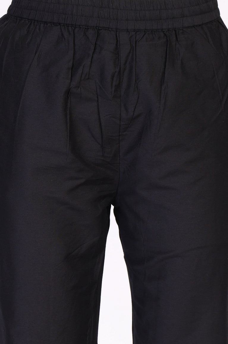 Elevate your casual wardrobe with this black kalamkari printed kurta co-ord set for women from Folksong, a harmonious blend of tradition and modernity. This set comprises a knee-length A-line kurta and mid-rise straight pants, both tailored from 100% pure cotton for breathable, all-day comfort. Designed with a round neckline, 3/4th regular sleeves, and adorned with delicate sequin detailing, the kurta offers a refined aesthetic. The black backdrop enhances the all-over floral print, making it a versatile piece for everyday ethnic wear. The pants come with a drawstring waistband for an adjustable fit. Crafted for Indian summers, this outfit ensures elegance without compromising on ease. Ideal for daytime gatherings, workwear, or casual outings, it’s a timeless addition to your ethnic closet.