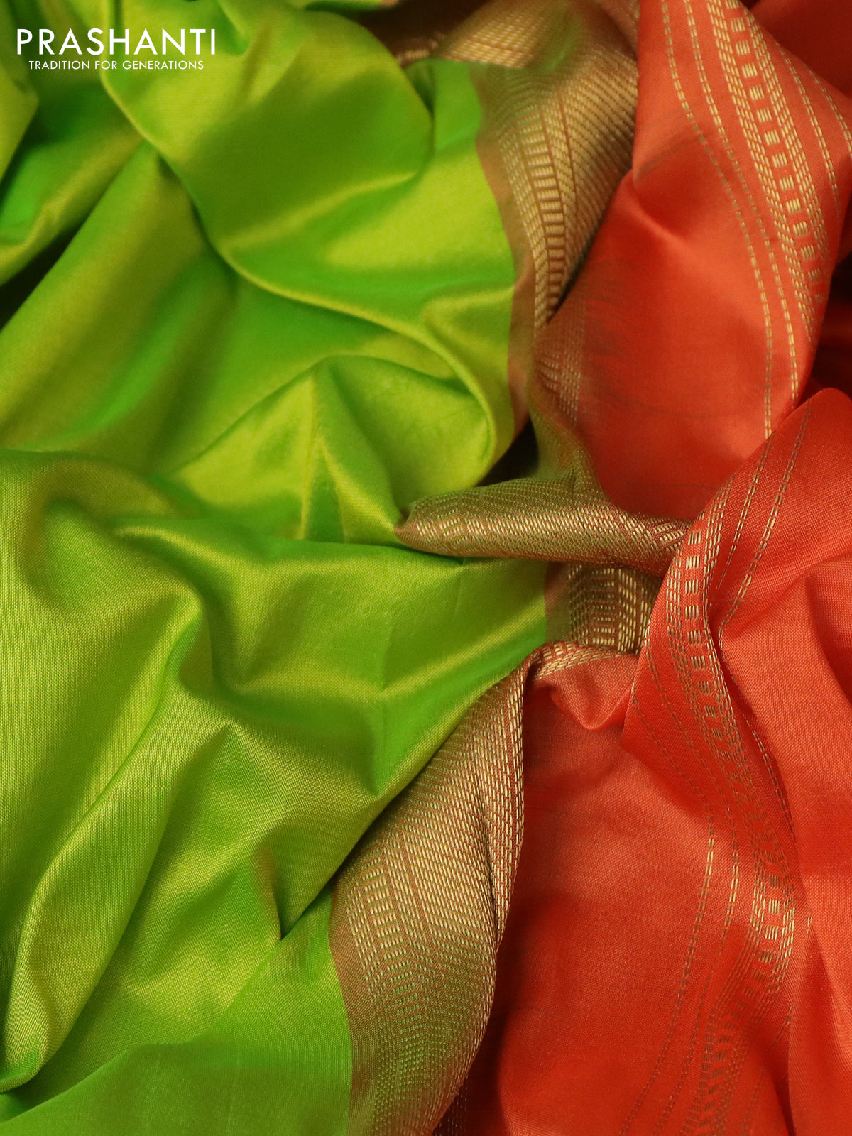 10 Yards silk saree fluorescent green and orange with plain body and zari woven border