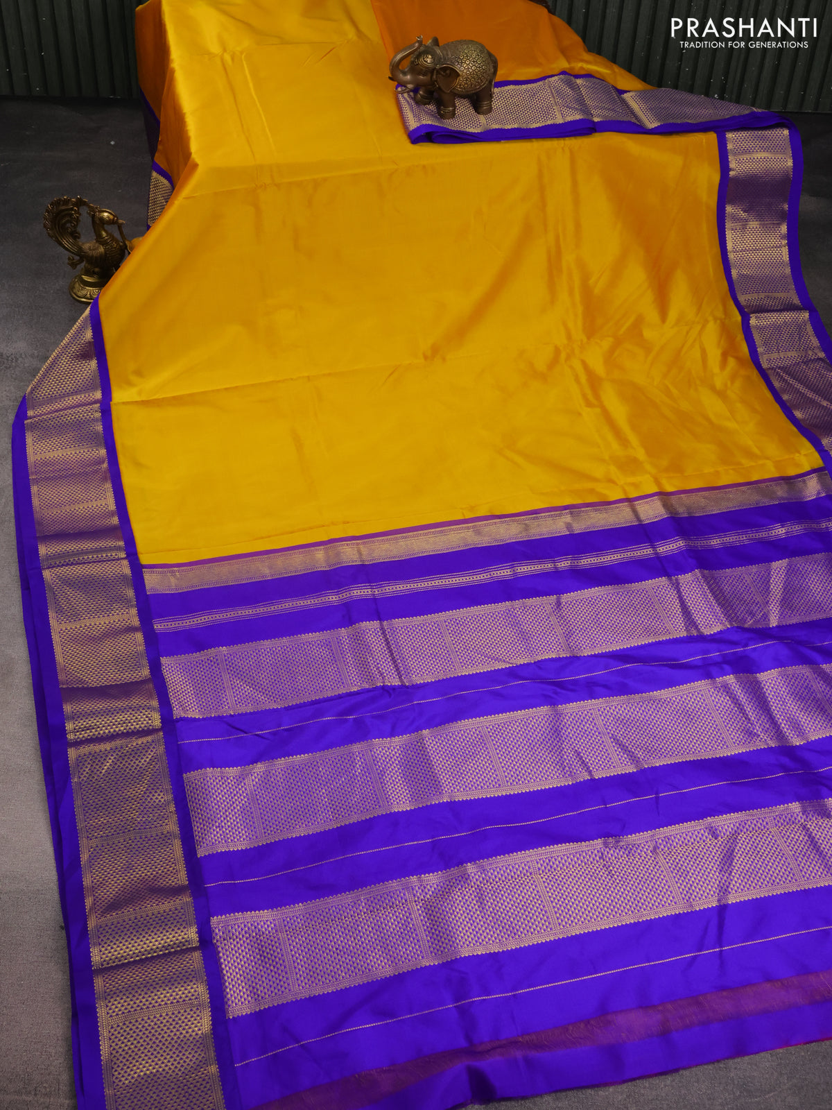 10 Yards silk saree mustard yellow and blue with plain body and zari woven border