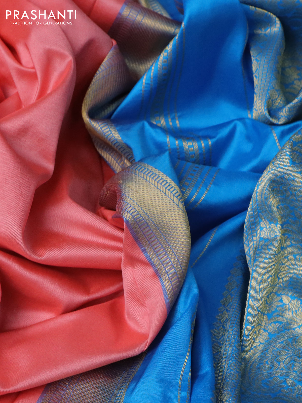 10 Yards silk saree peach pink and cs blue with plain body and zari woven border
