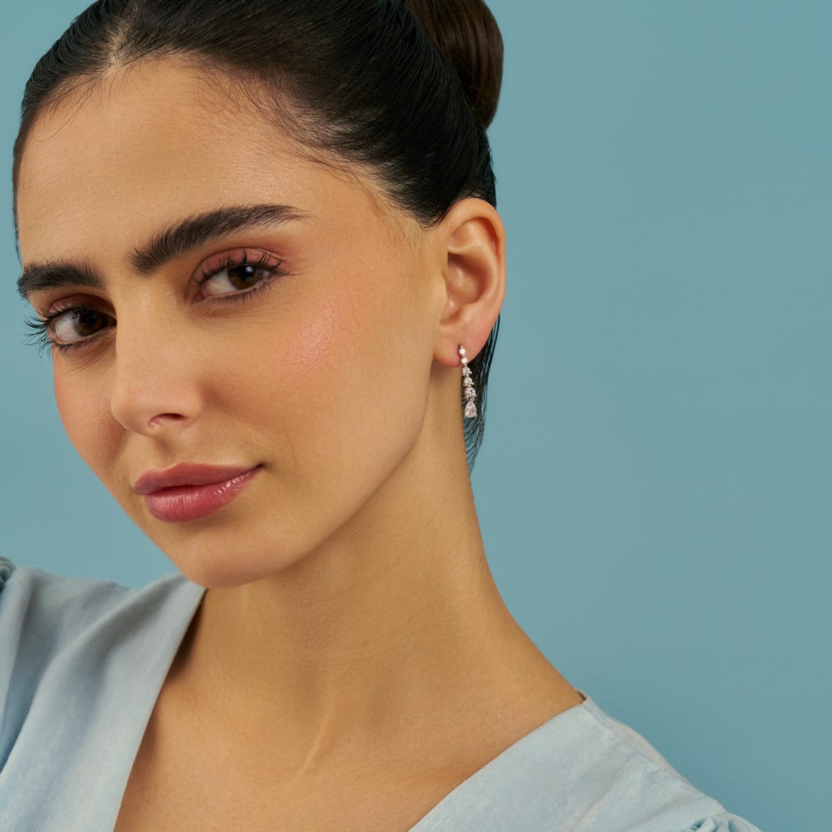 These 92.5 silver hanging earrings feature sparkling white zircon stones with a stunning zircon drop, available in rose gold, gold, or rhodium polish. Their versatile design makes them perfect for both Indian and Western outfits, adding an elegant and timeless touch to any look. Ideal for elevating your style on any occasion.