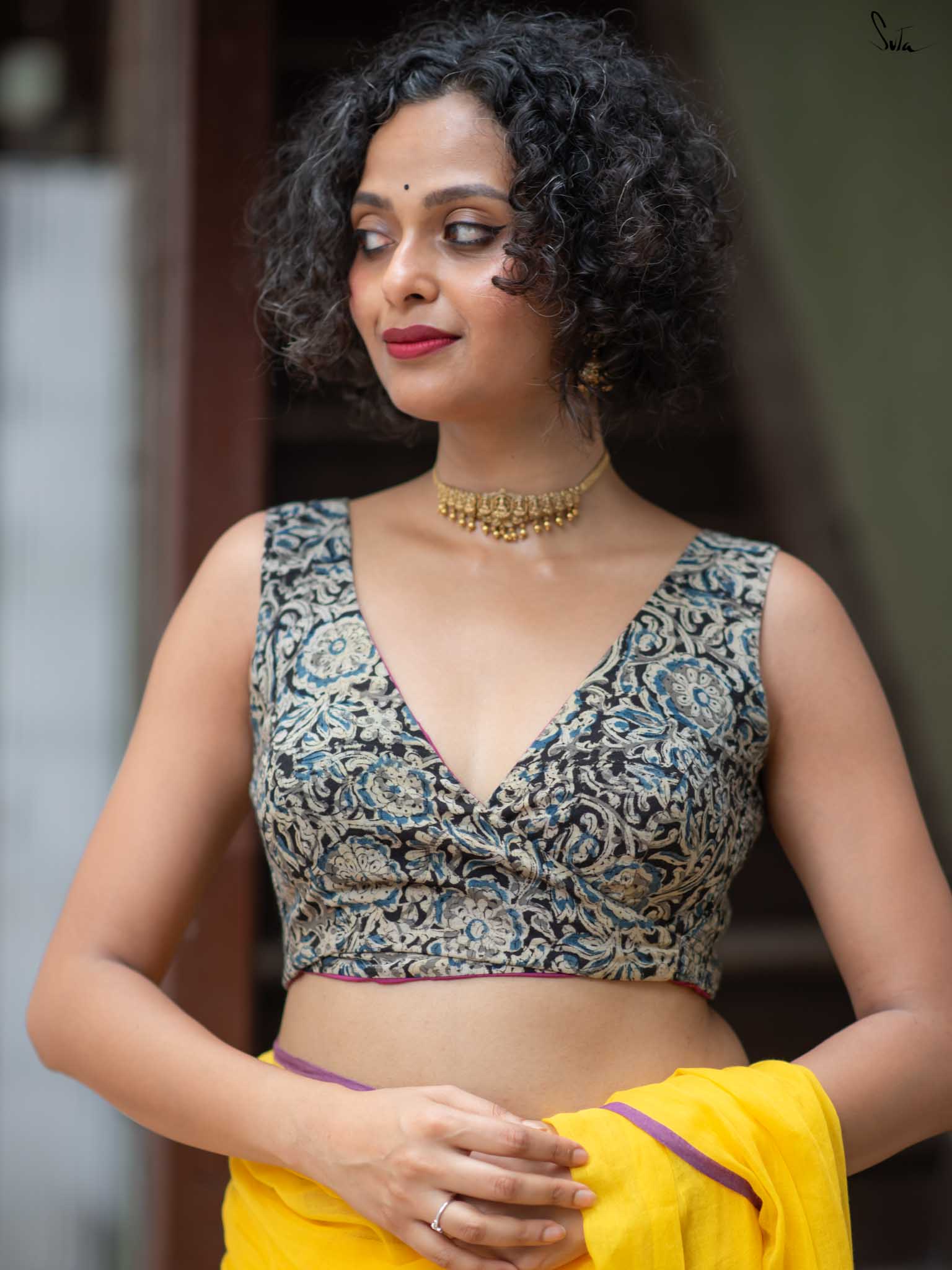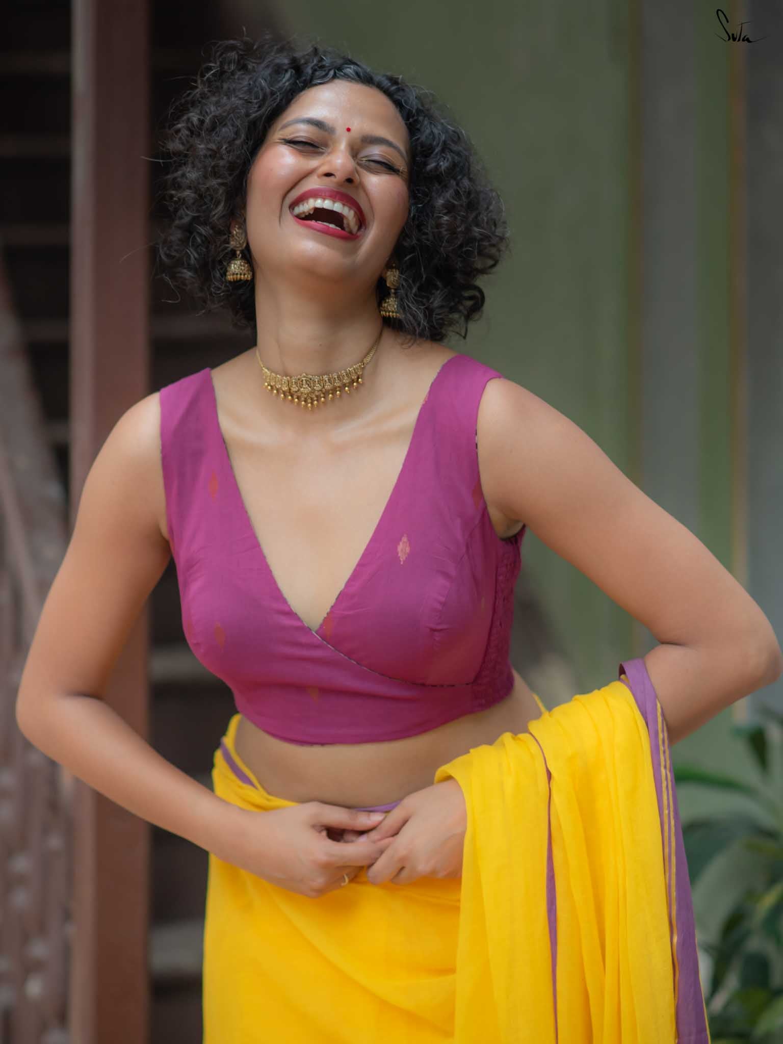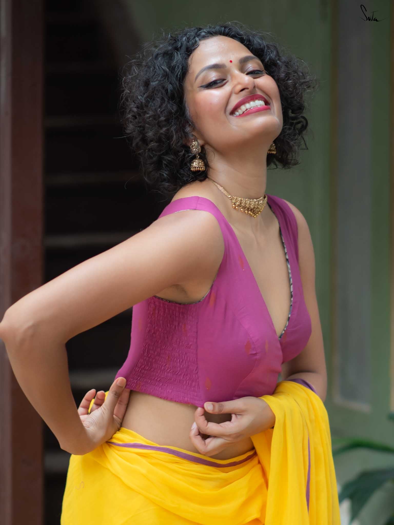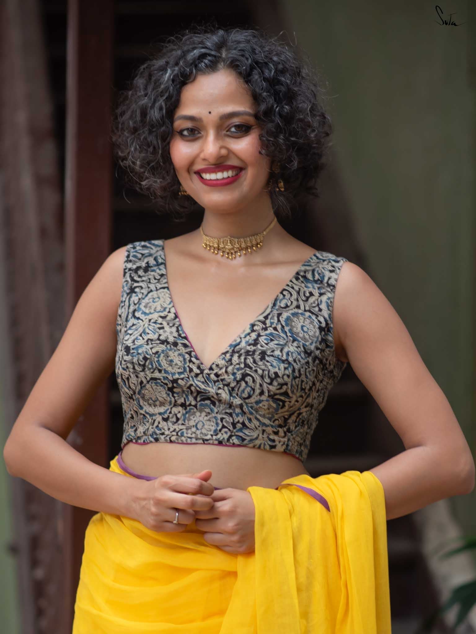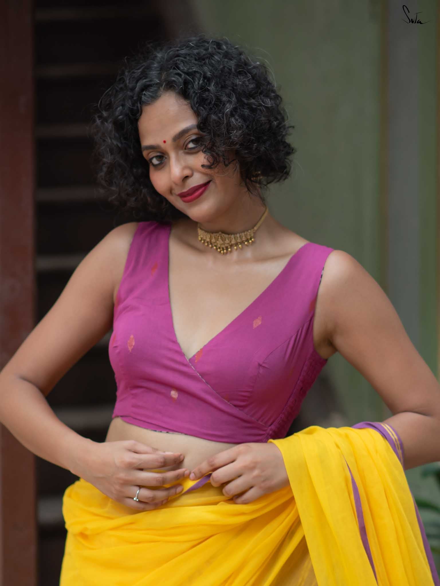 Su, the model is wearing size XS blouse and the saree Haldi hustle