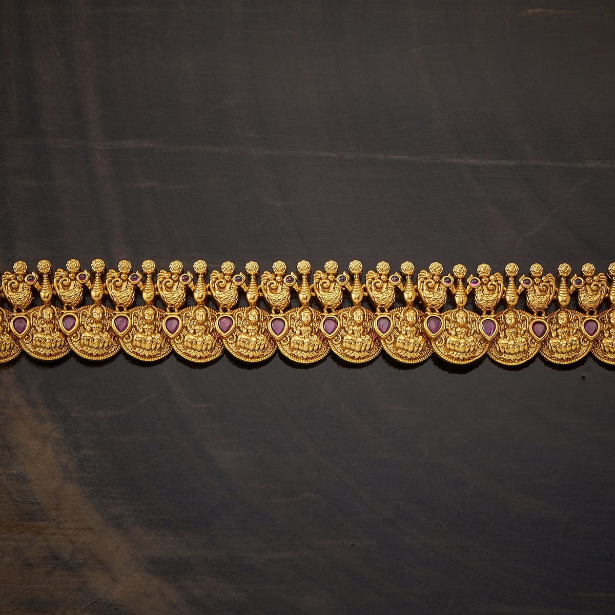 A wonderful choice for brides and bridesmaids, this antique-styled jewellery is perfect to be teamed up with silk sarees and half sarees at weddings and sagai. Encrusted with ruby red stones, this waist belt comes with Goddess Lakshmi and floral motifs that shows delicate craftsmanship. Wear this kamarbandh to other traditional ceremonies to heighten your feminine charm.