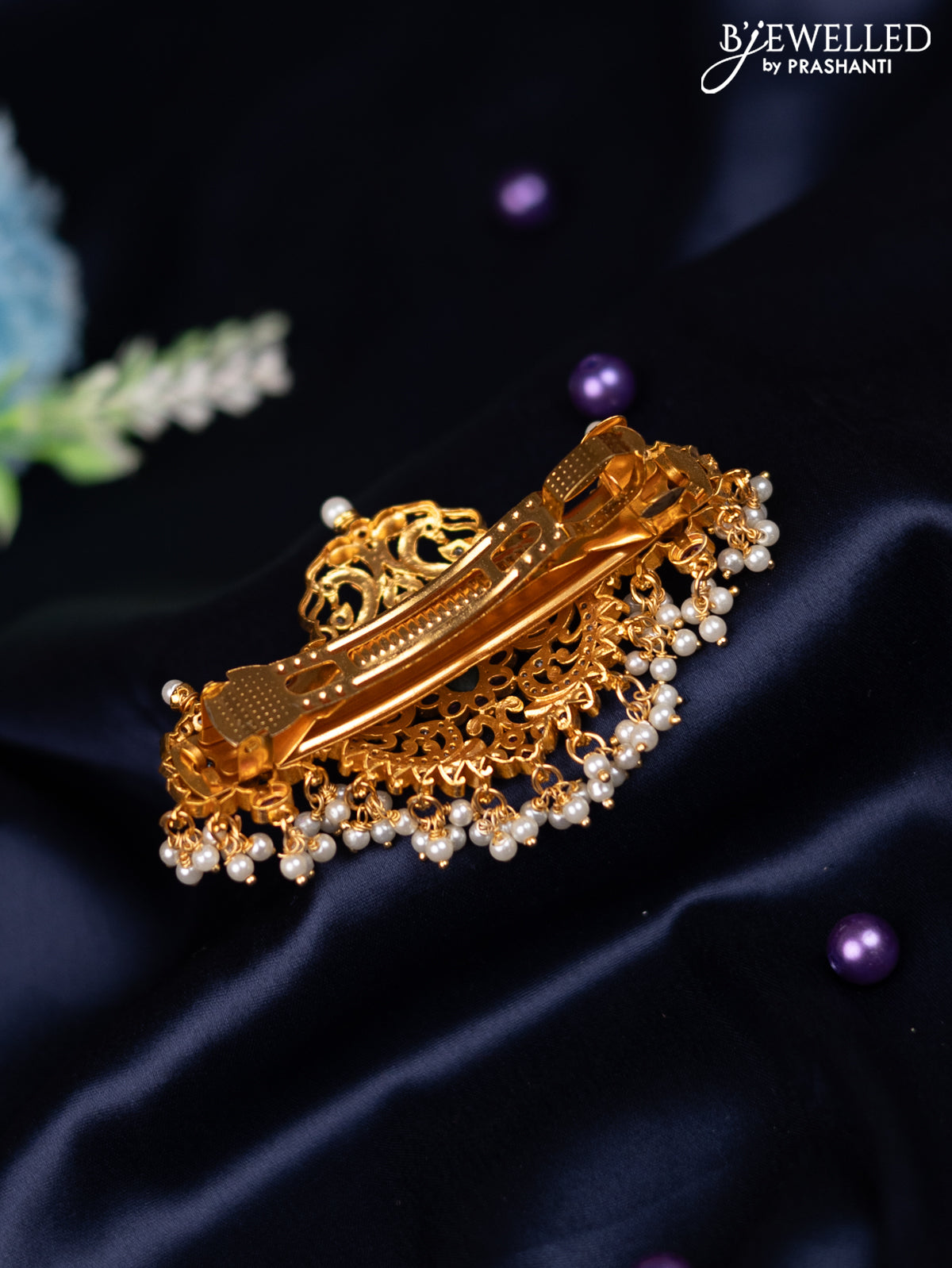 Antique hair clip medium size peacock design with kemp & cz stones and pearl hangings