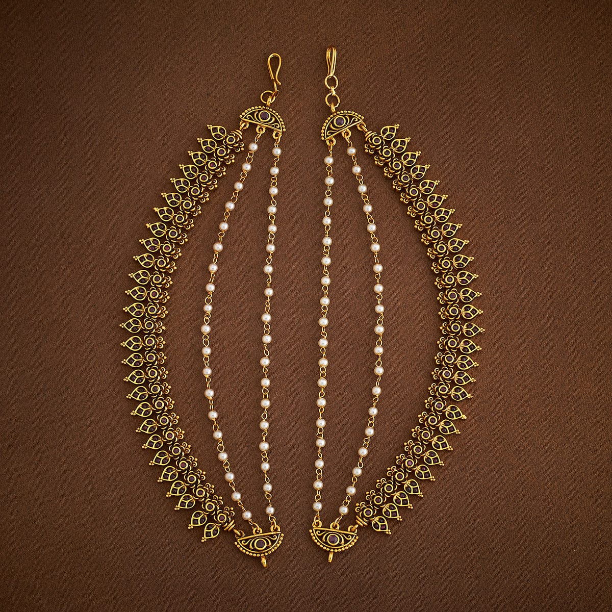 Transform your saree into a statement of tradition with this exquisite antique matil! Decked out in small green or ruby-green synthetic stones, white beads, and a gold polish, this Kushal's Fashion Jewellery piece is the perfect blend of elegance and heritage. Let your hair sparkle with timeless charm!