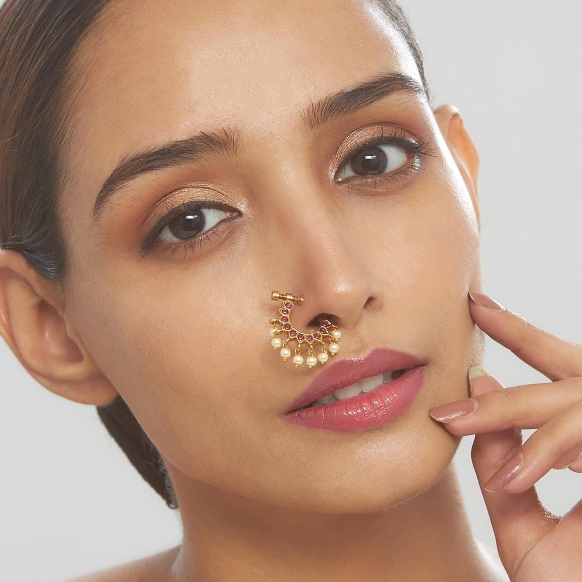 Rock Kushal's antique nath with your favourite traditional outfit, flaunting dazzling synthetic stones and chic gold polish. With a trendy ruby or ruby-green stone colour to choose from, this lightweight beauty is perfect for any occasion. Crafted from copper alloy, it’s the ultimate accessory for your ethnic game.