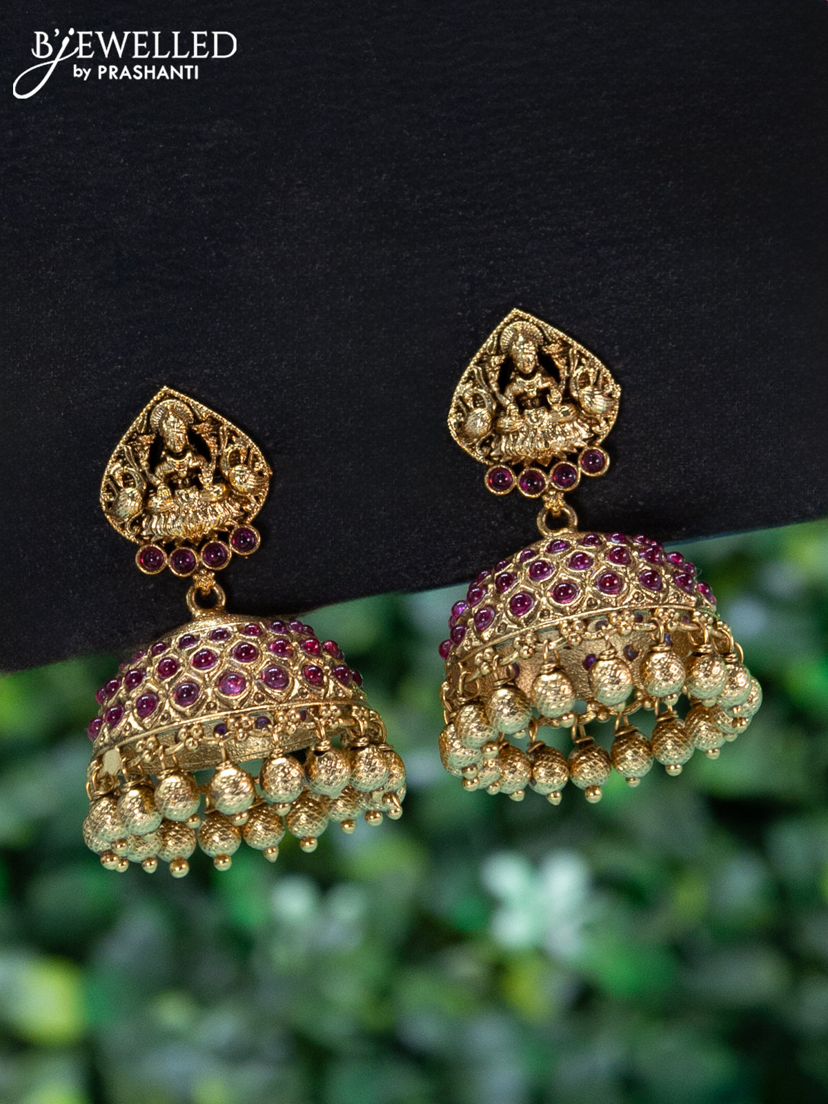 Antique necklace lakshmi kasu design with pink kemp stones and golden beads hangings