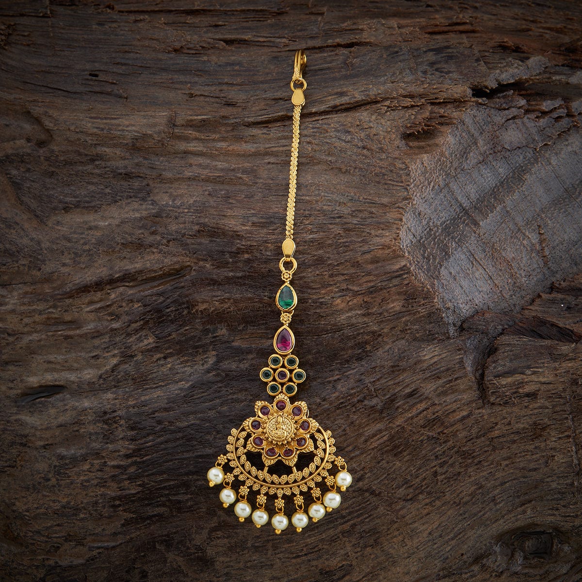Looking for some beautiful hair accessories for a traditional event? This antique Tikka is a perfect piece to add to your traditional look. The floral carving and tiny leaf design embellished with Ruby stones and hanging pearls are alluring enough for a stunning presence. Style it with loose hair or any other hairstyle and impress everyone on this festive occasion.