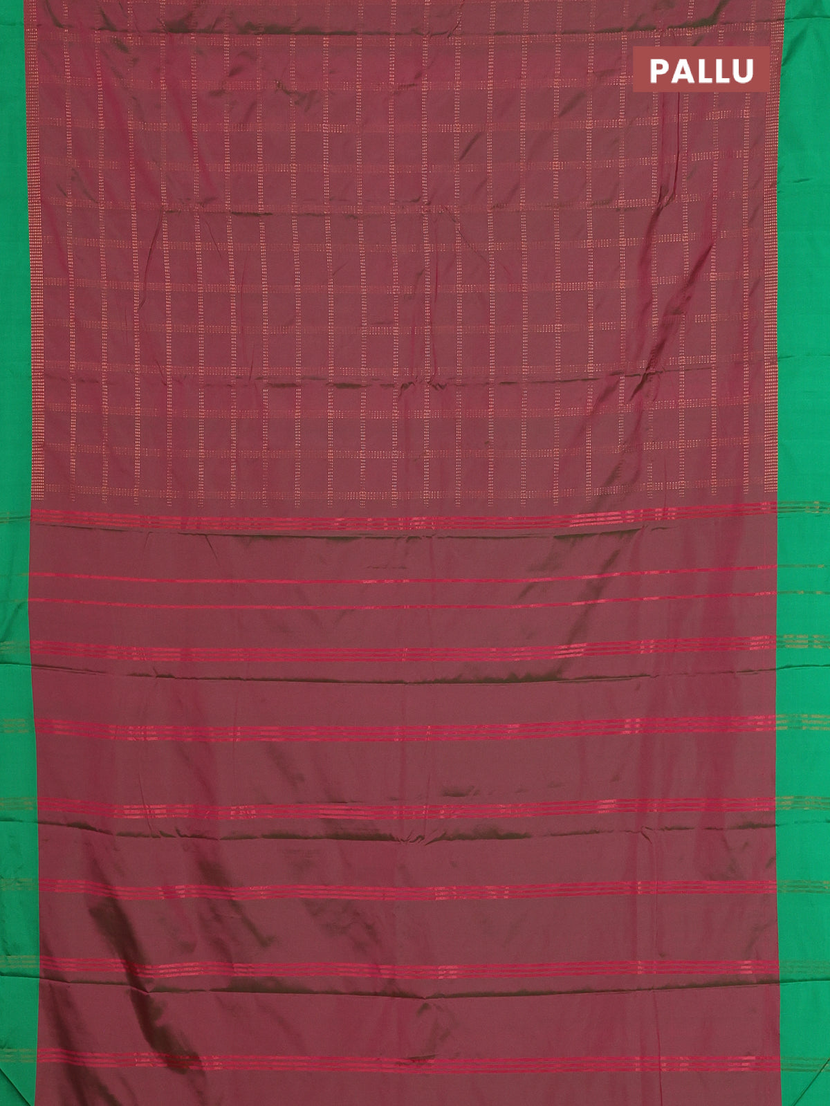 Arani semi silk saree dual shade of maroon and green with allover copper zari checked pattern and copper zari woven simple border