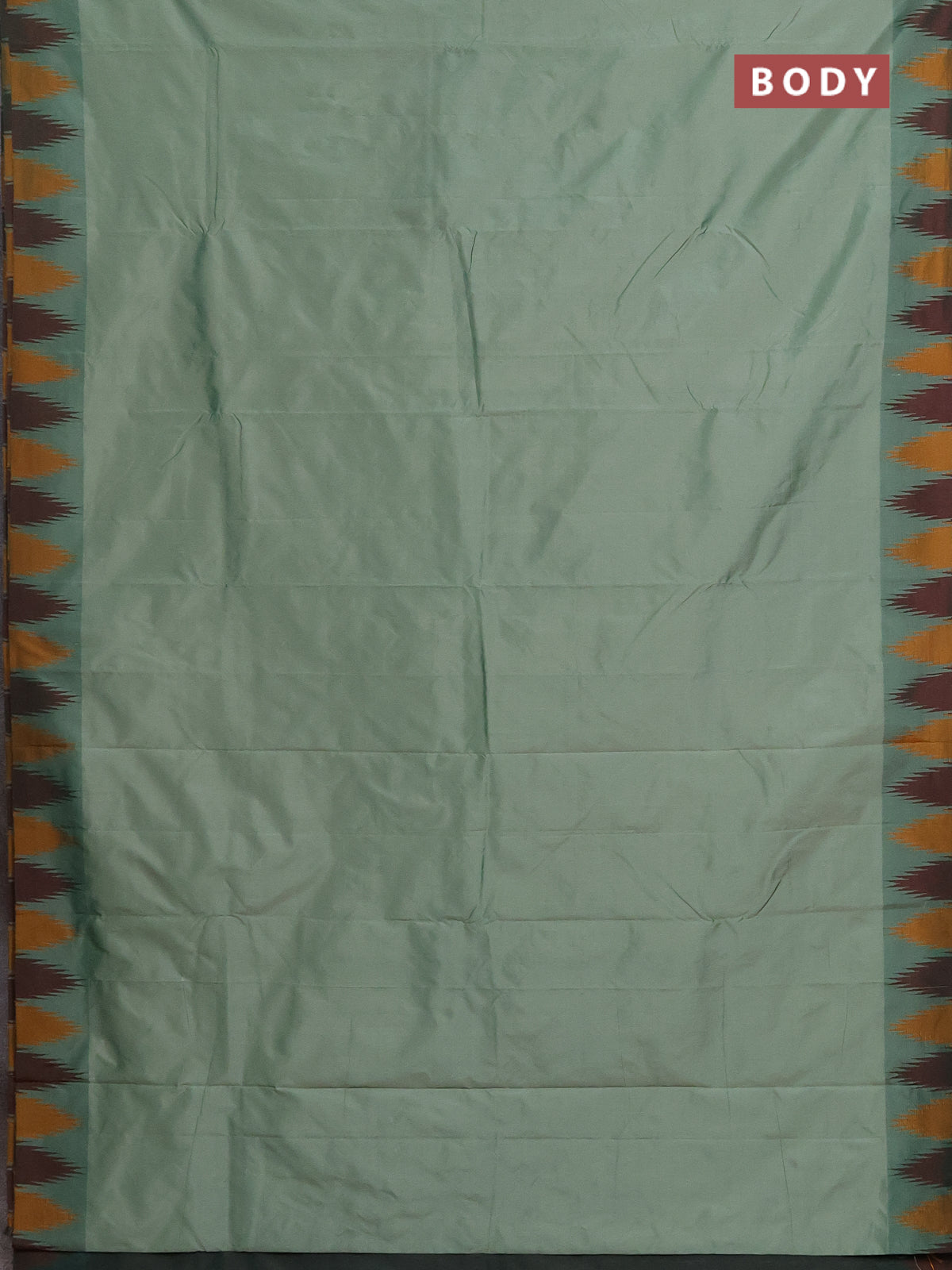 Arani semi silk saree pastel green shade and mustard yellow maroon with plain body and temple design border