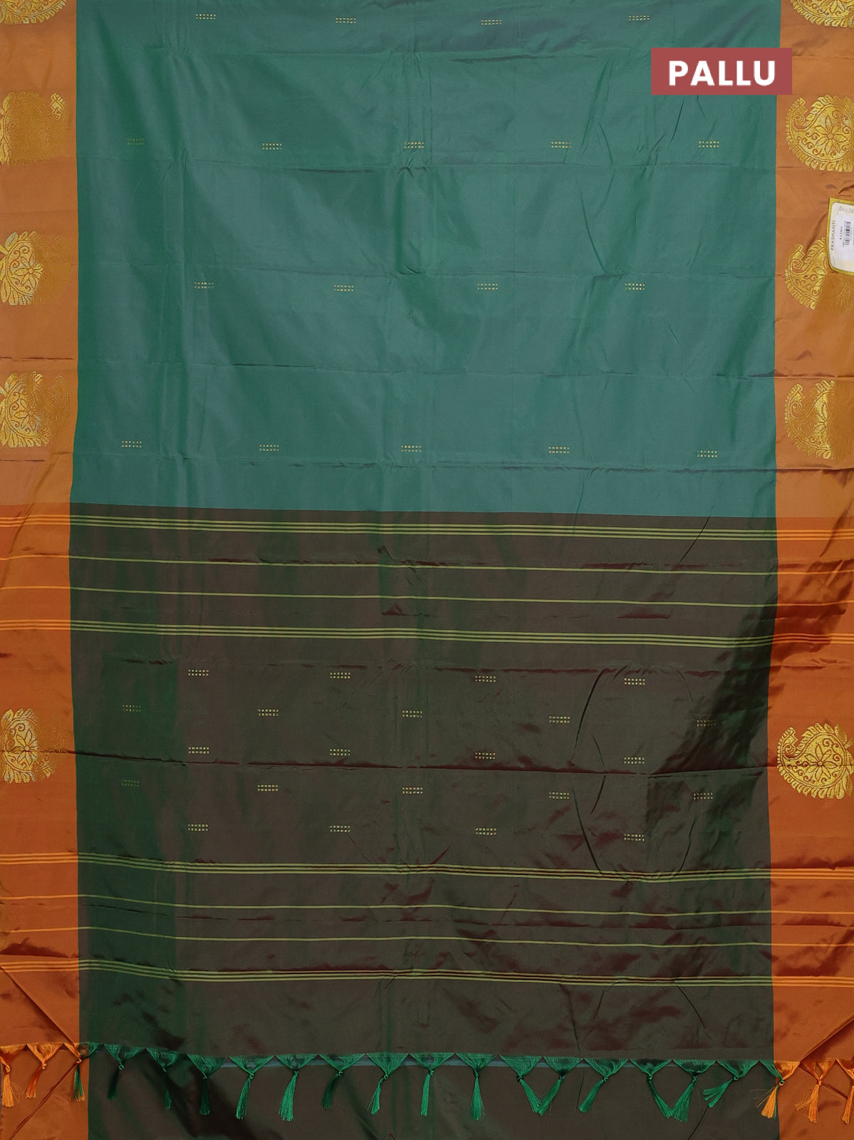 Arani semi silk saree teal green and mustard yellow with zari woven buttas and paisley zari woven butta border