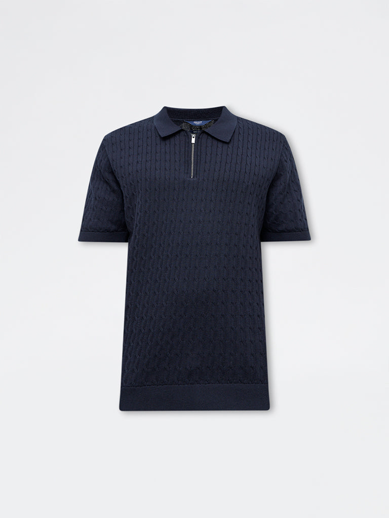 Ascot brings this polished black polo t-shirt designed in a comfortable relaxed fit. It is crafted from a cotton-rich fabric with a cable-knit texture that allows breathable ease and elevates the silhouette. A classic collar, brief zipper placket and short sleeves complete the look with a clean, structured finish.