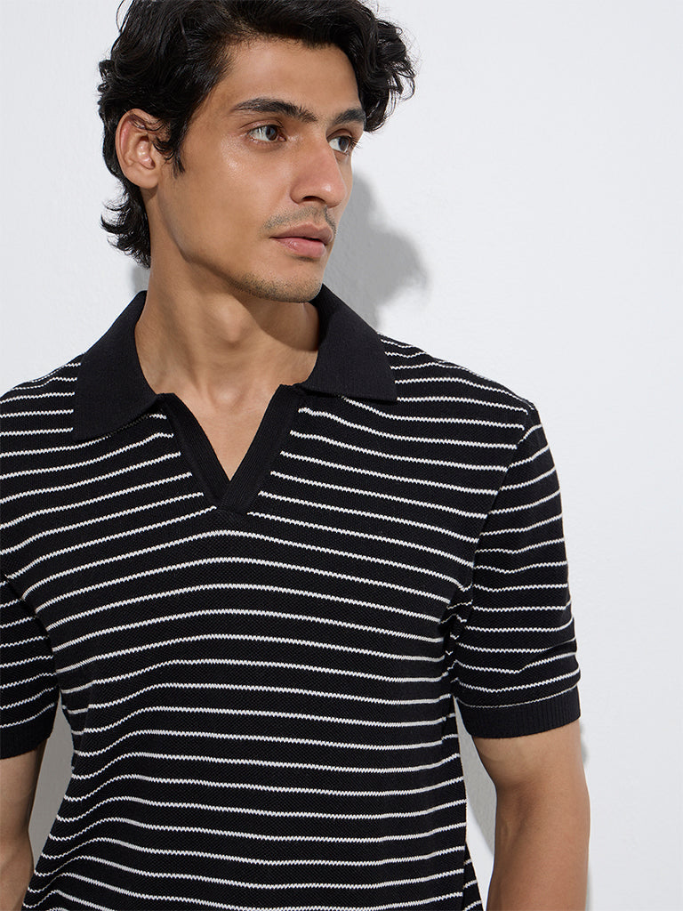 Ascot Black Striped Relaxed-Fit Cotton-Blend Polo T-Shirt