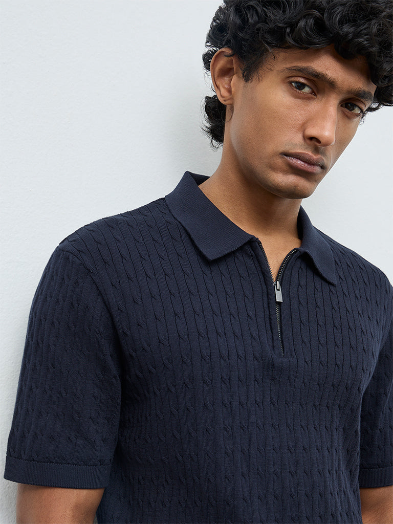 Ascot introduces this navy polo T-shirt, designed with a relaxed fit that balances comfort with a refined look. Crafted from a cotton rich fabric, it features a cable knit texture that enhances breathability while adding depth to the silhouette. Finished with a classic collar, a short zipper placket and short sleeves, it delivers a clean, structured appeal suited for everyday wear.