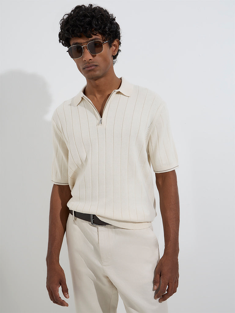 This off-white polo t-shirt from Ascot highlights self-stripes that lend depth to its refined look. Constructed from a stretch-infused cotton-blend material, it features a spread collar with a quarter-zip detail, half sleeves, and a ribbed hem that ensures a structured yet comfortable fit.