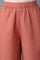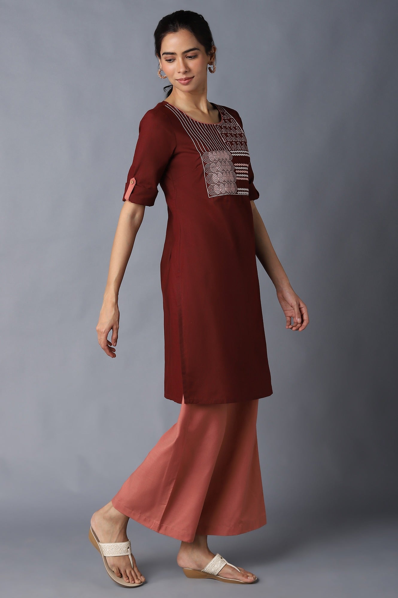 Step Out In Confidence With This Stunning And Statement-Making Modern Ethnic Suit Set. The Set Includes Brick Red Solid Round Neck kurta In Staright Silhouette, It Features Thready Embroidery. kurta Is Coordinated With Dark Peach Straight Palazzo Pants.