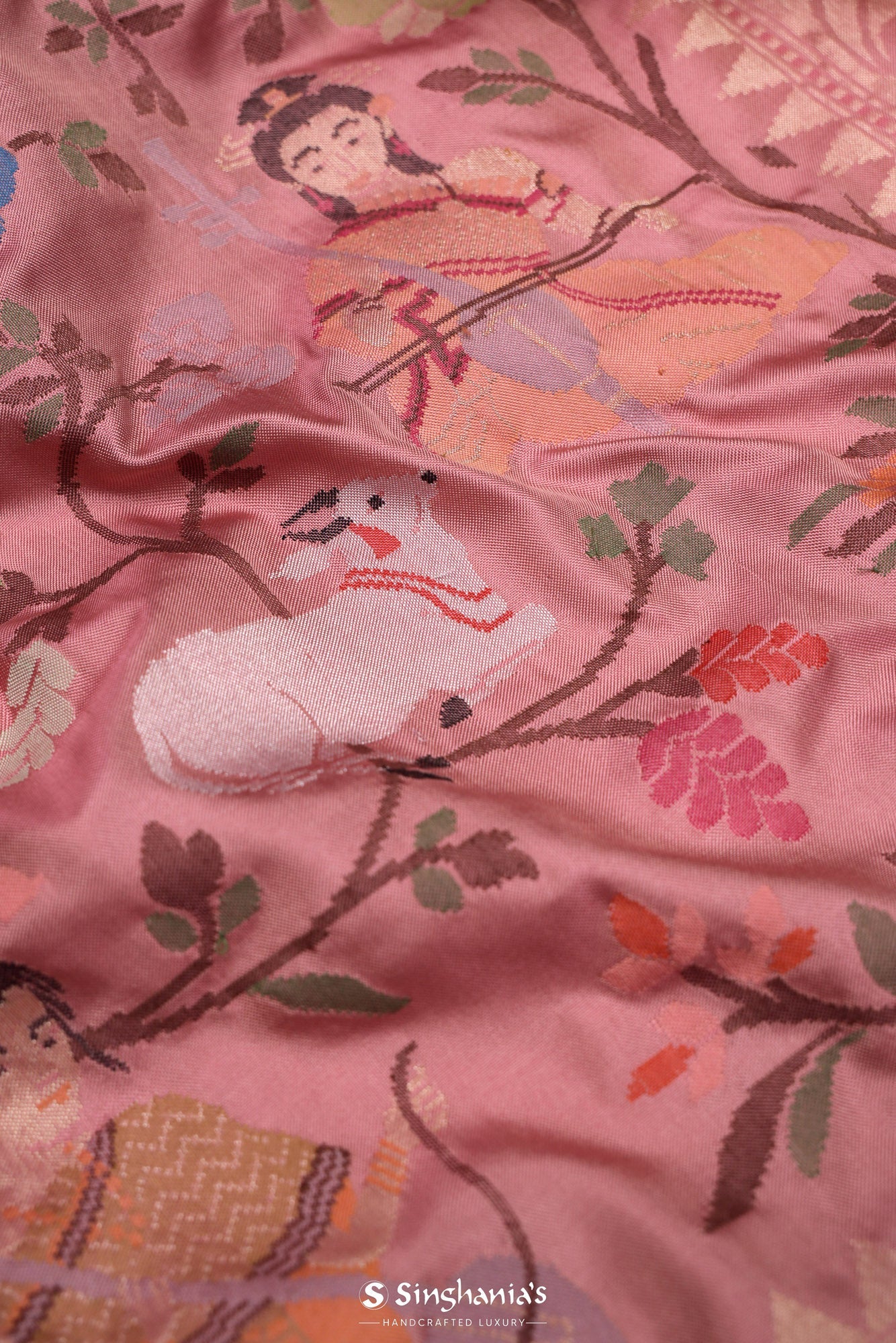 Baby Pink Banarasi Silk Saree With Floral, Fauna & Human Figures