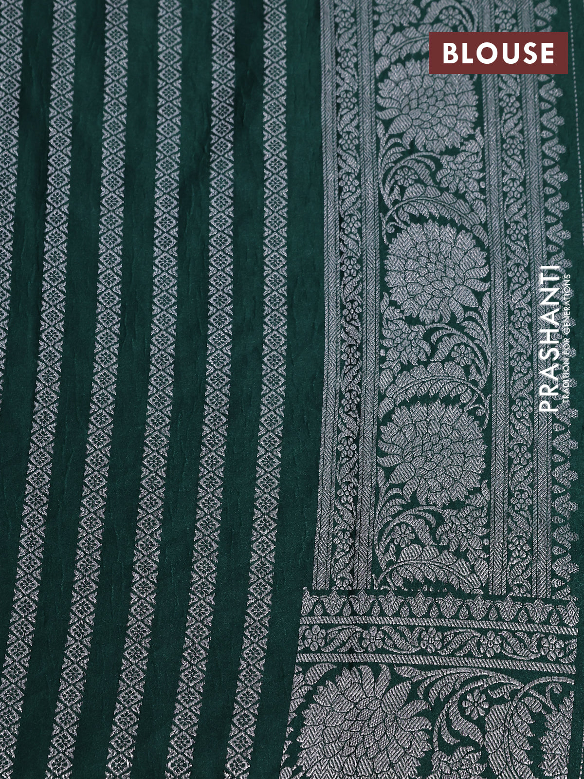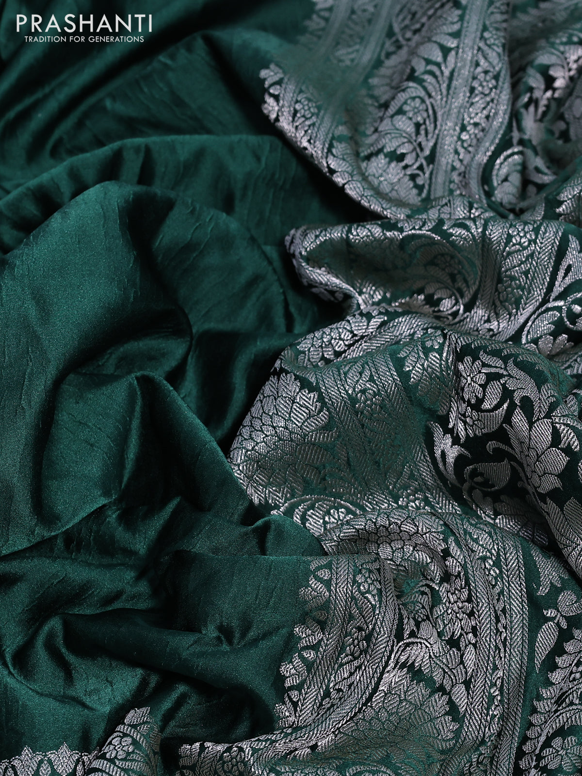 Banarasi crush crepe saree dark green with plain body and silver zari woven floral border