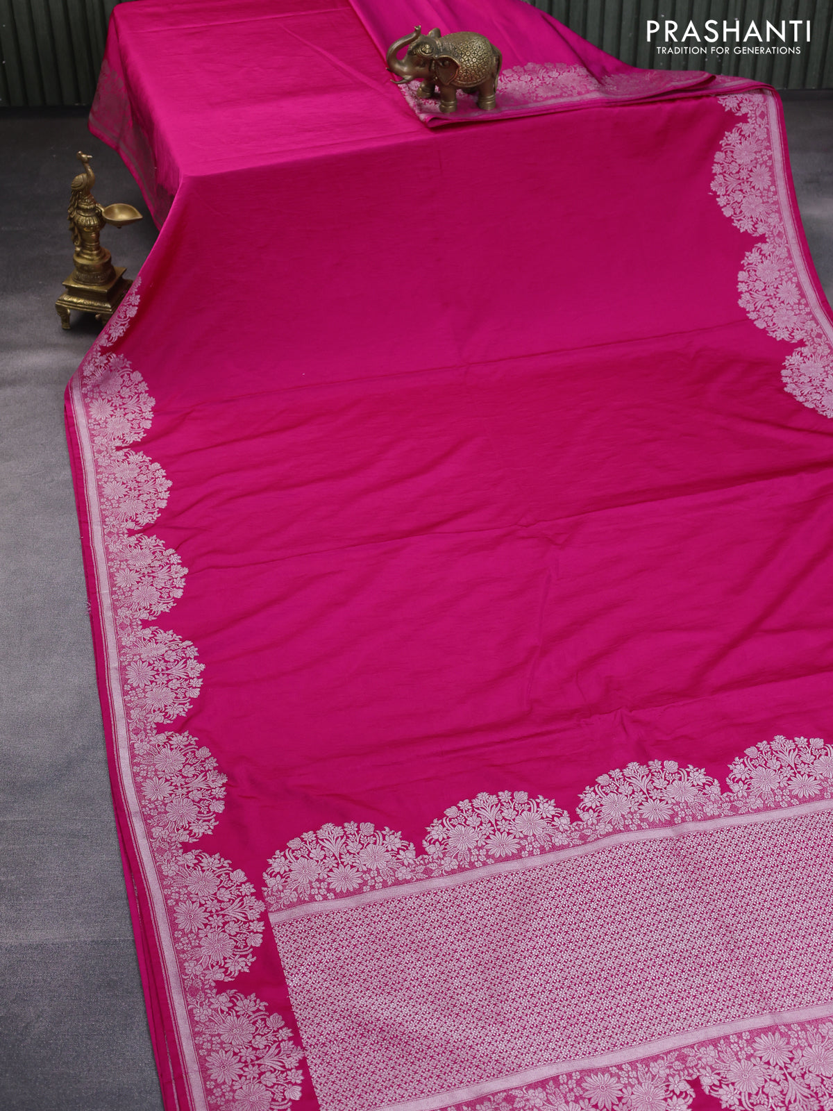 Banarasi crush crepe saree pink with plain body and silver zari woven floral border