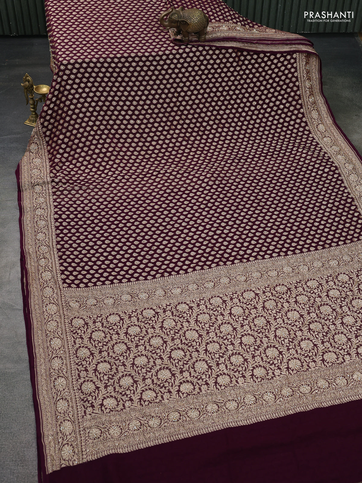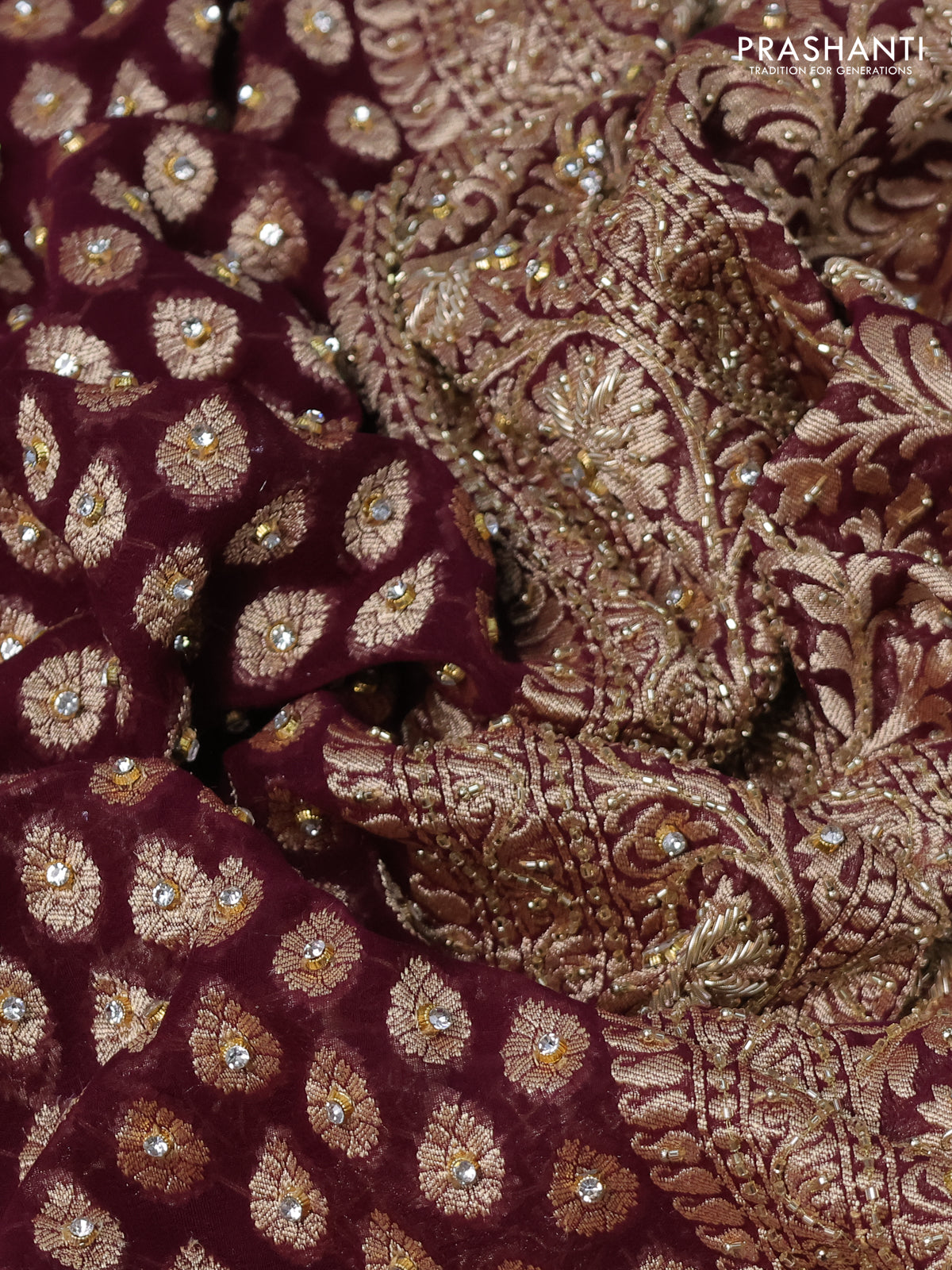 Banarasi georgette saree wine shade with woven buttas & stone work and zardosi work border