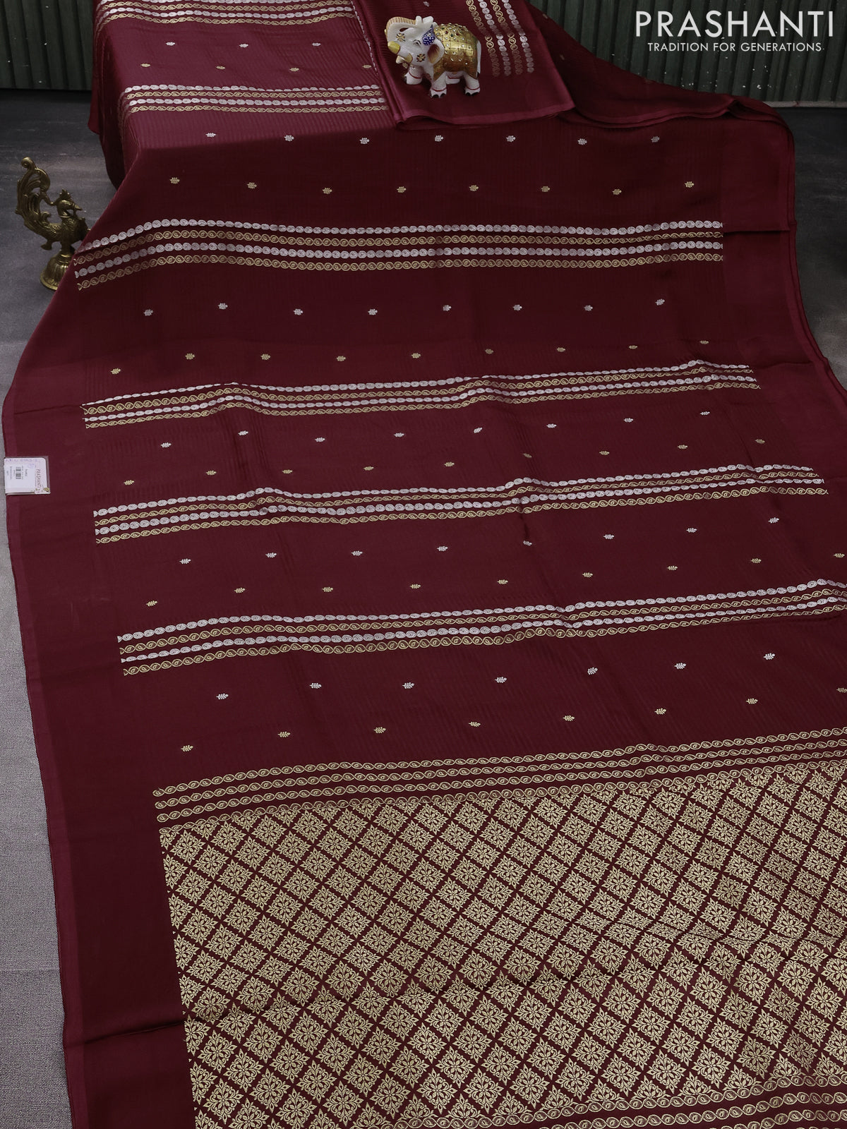 Banarasi mushru silk saree maroon with allover stripes pattern & zari weaves and satin border