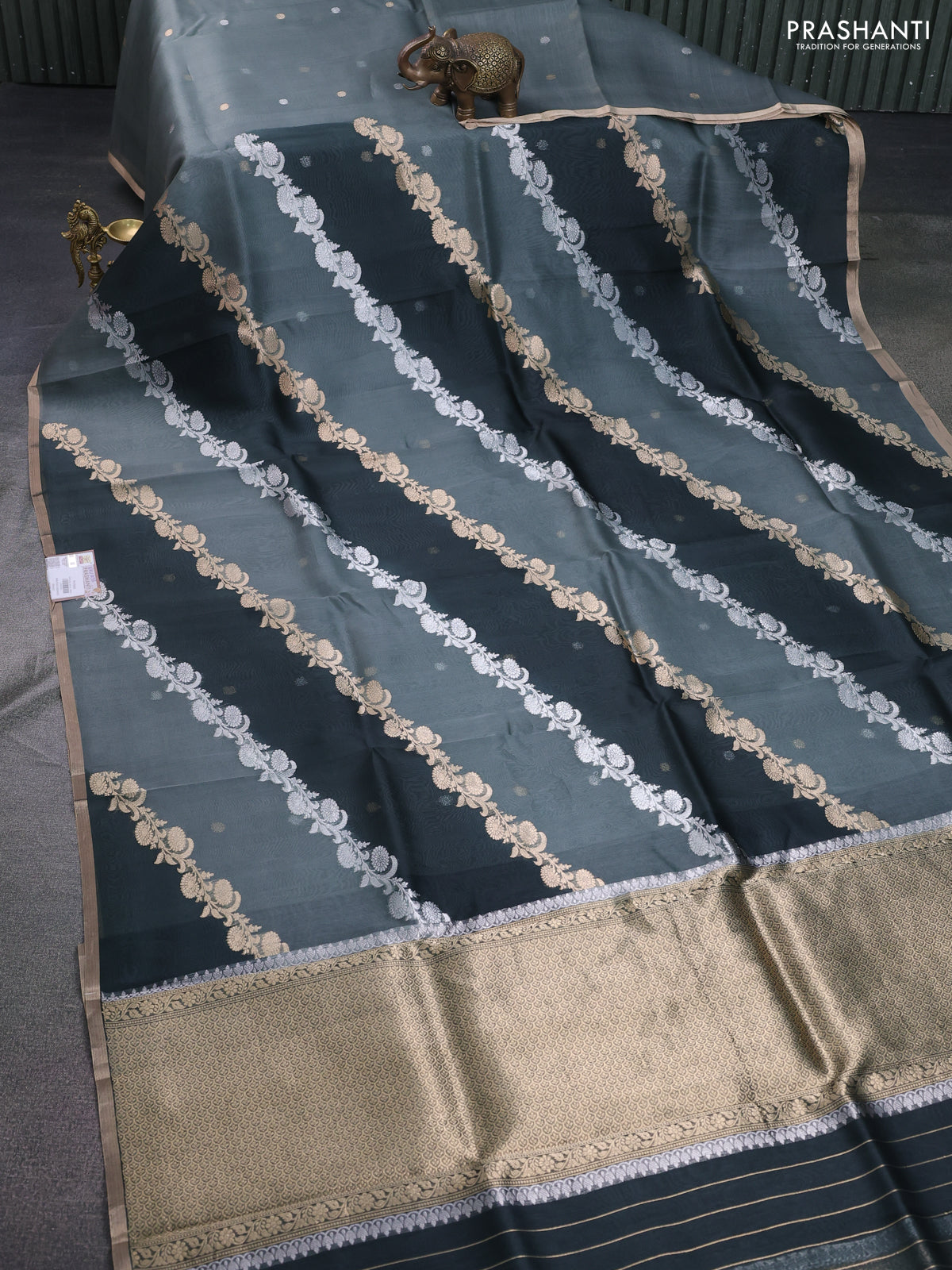 Banarasi organza silk saree greyish green with silver & gold zari weaves and zari woven piping boder