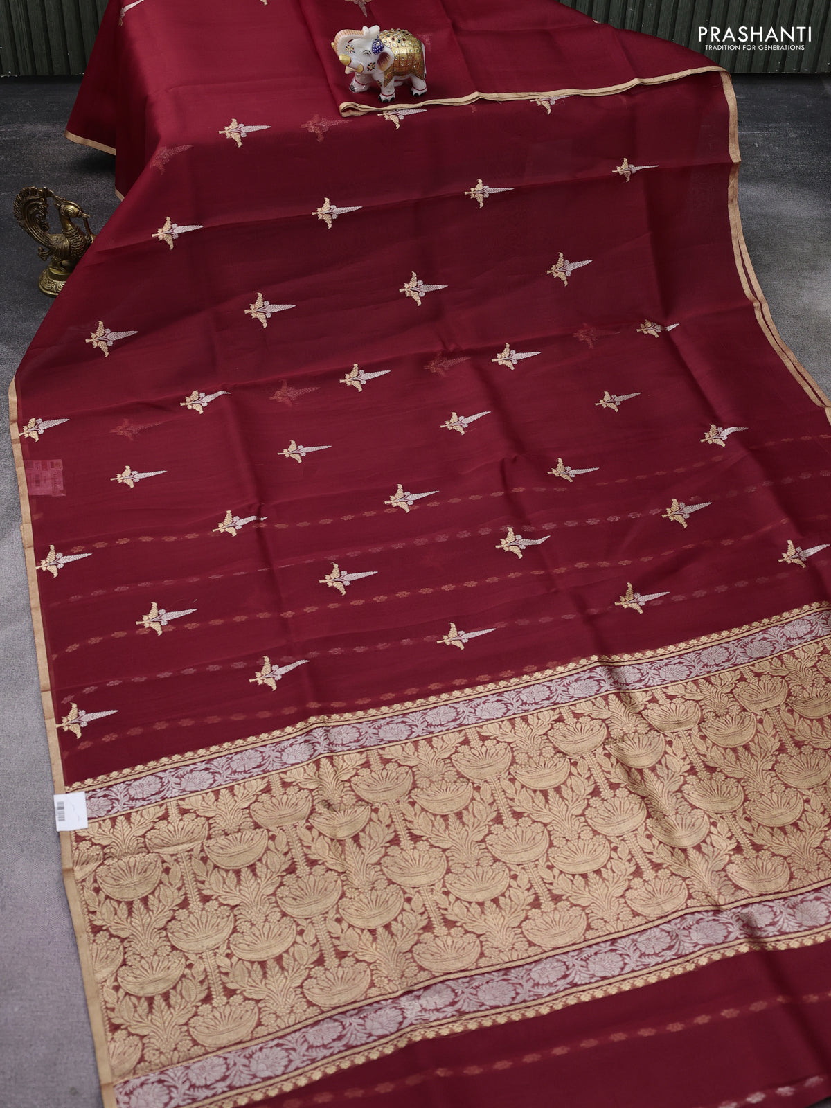 Banarasi organza silk saree maroon with zari woven buttas and zari woven piping border
