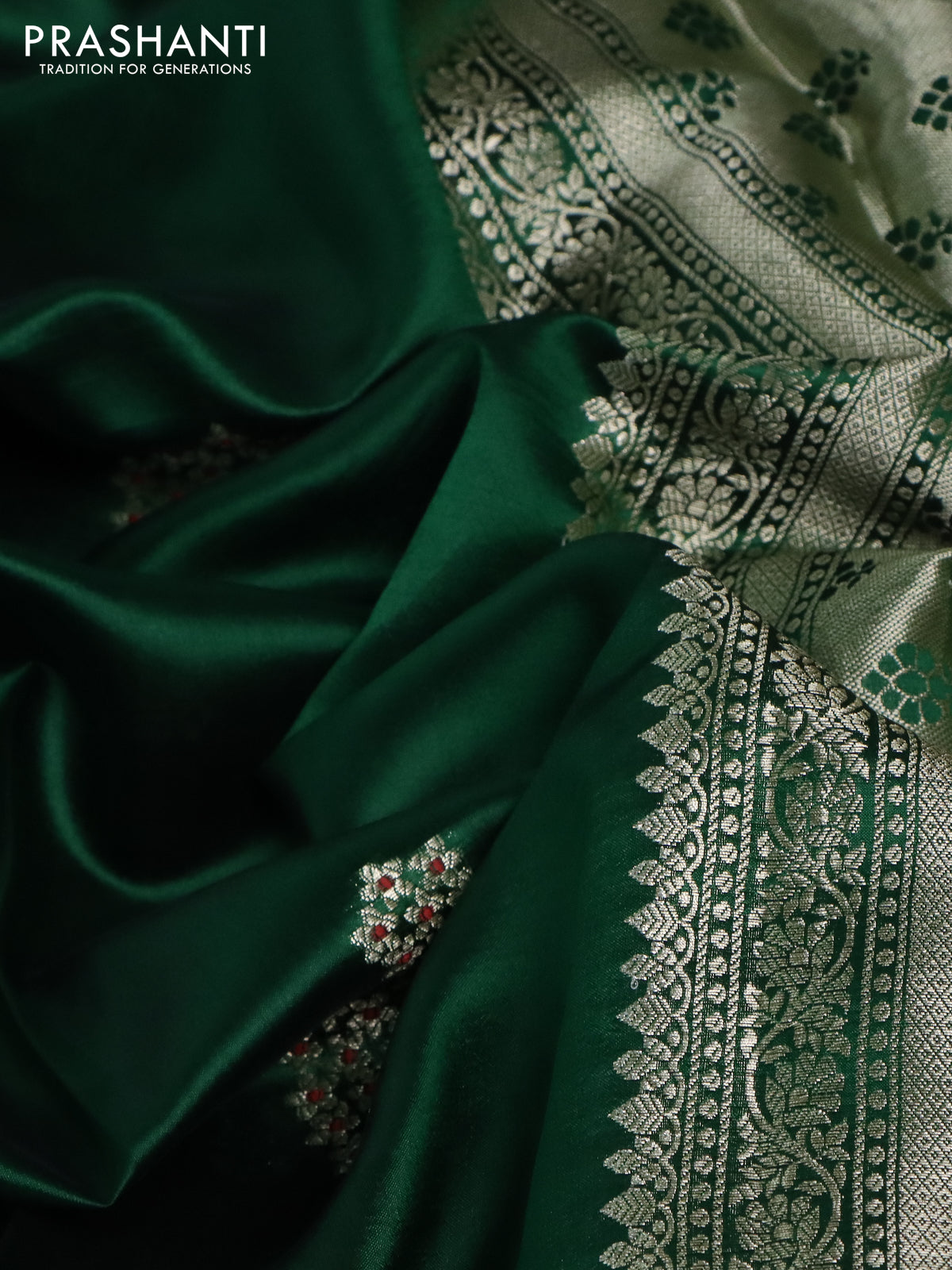 Banarasi poona silk saree green and red with zari woven floral buttas and zari woven butta border