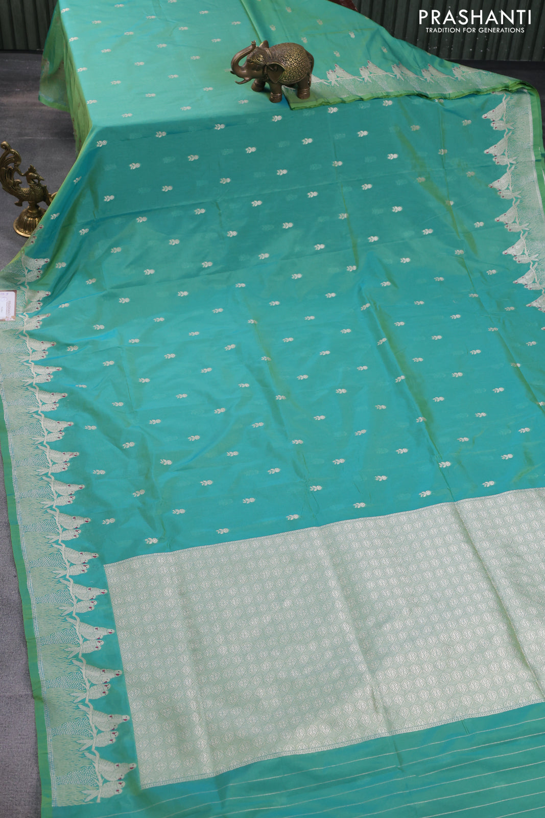 Banarasi semi katan silk saree dual shade of teal bluish green with allover zari woven buttas and parrot design zari woven border