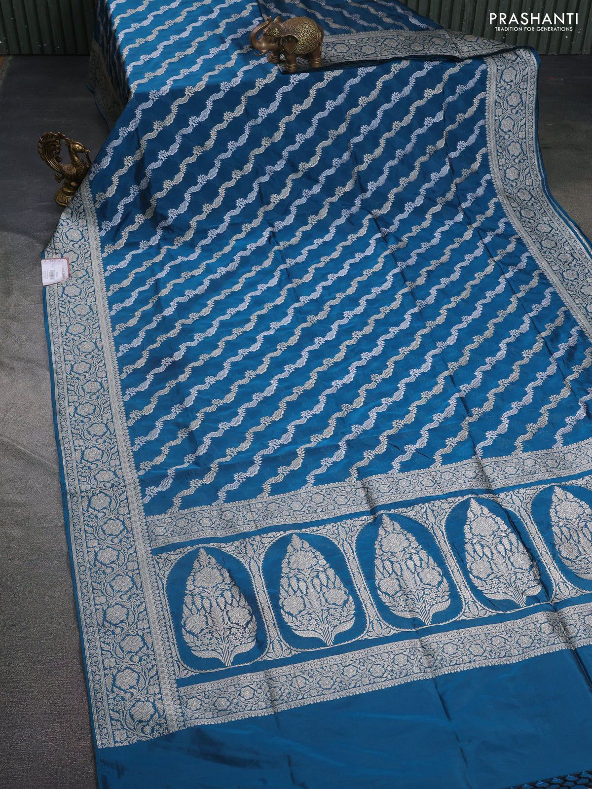 Banarasi semi katan silk saree peacock blue with allover silver & gold zari weaves and floral zari woven border