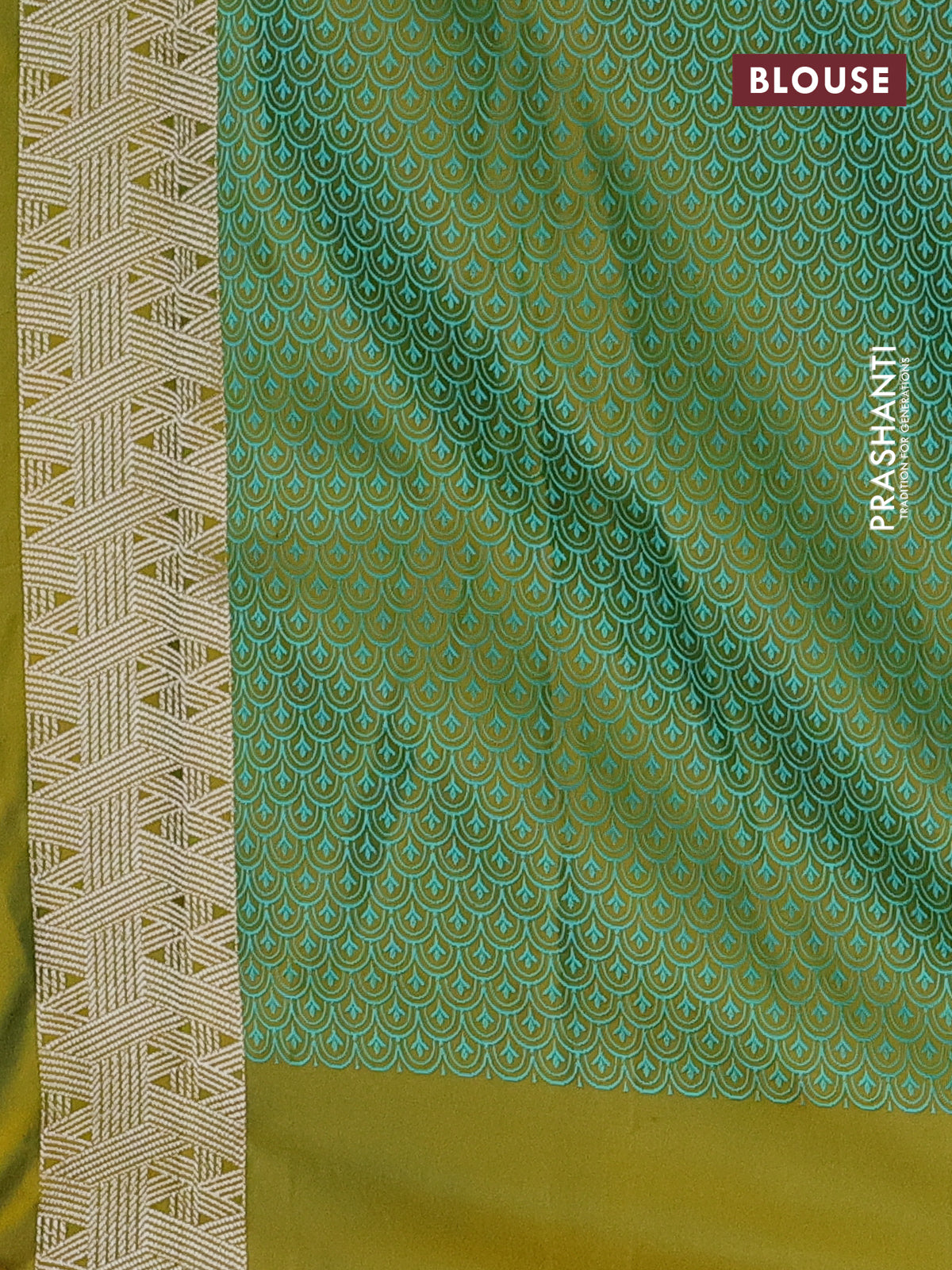 Banarasi semi mushru silk saree dual shade of mustard yellow and teal blue with allover self emboss & zari buttas and zari woven border