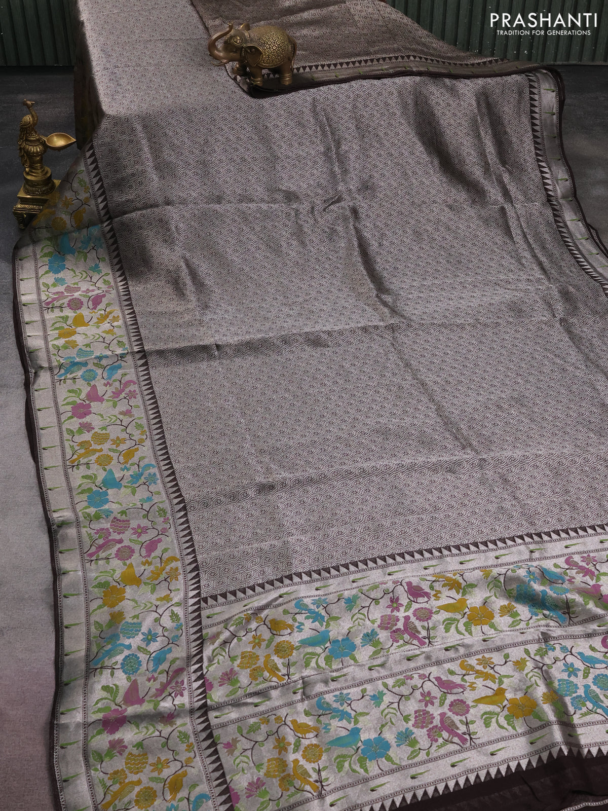 Banarasi semi raw silk saree deep coffee brown with allover silver woven brocade weaves and floral design paithani border