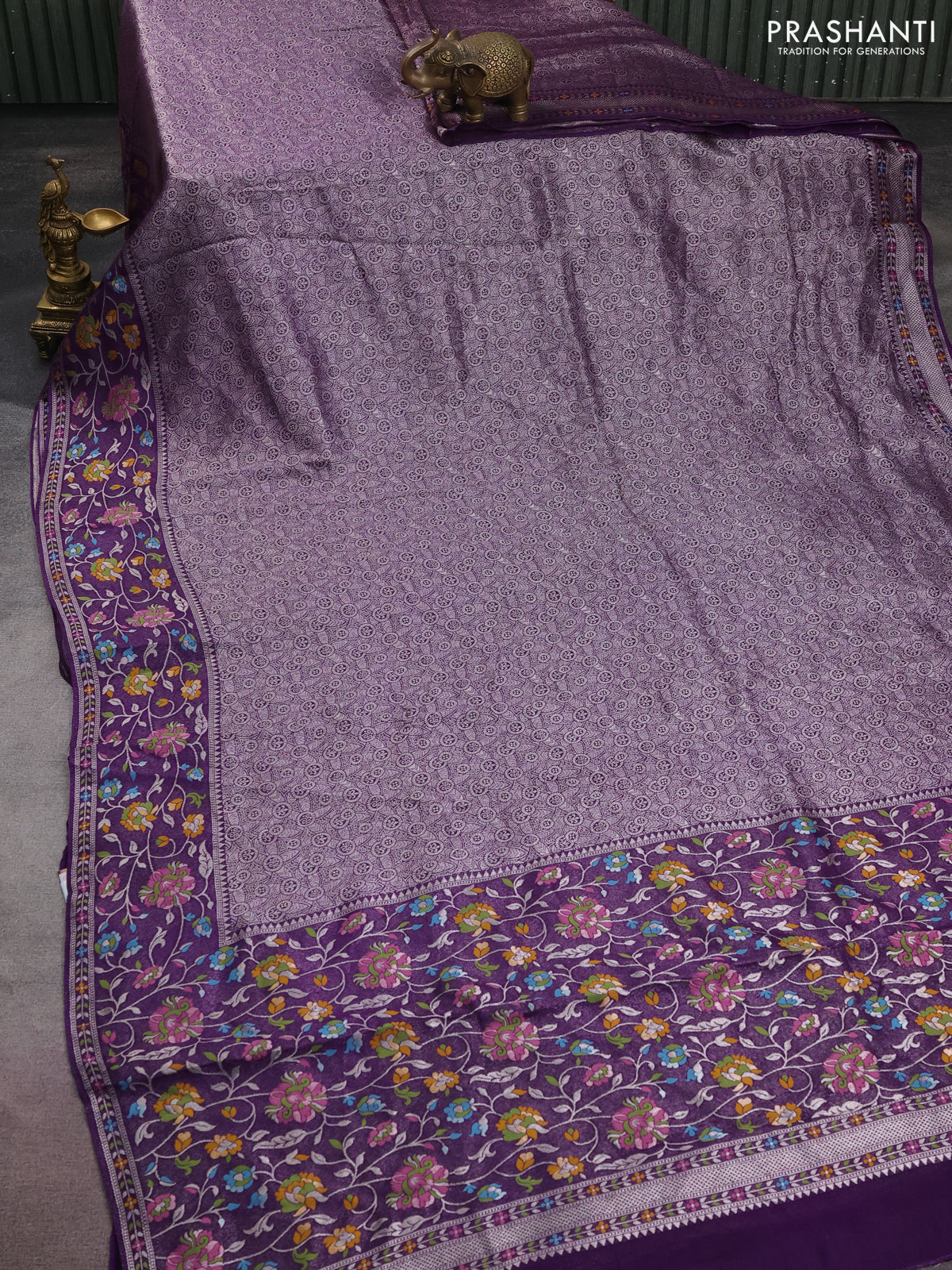 Banarasi semi raw silk saree violet with allover silver zari woven brocade weaves and floral design paithani border
