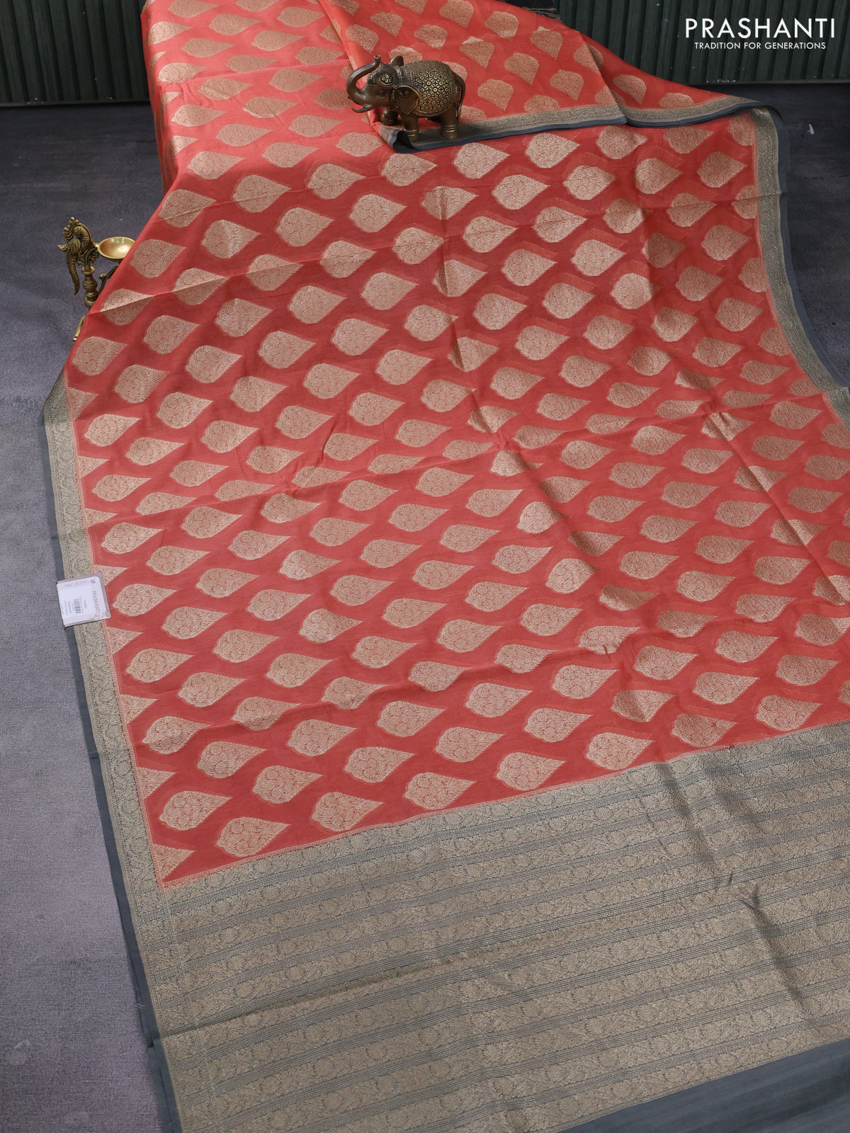 Banarasi silk cotton saree peach orange and grey with woven buttas and woven border