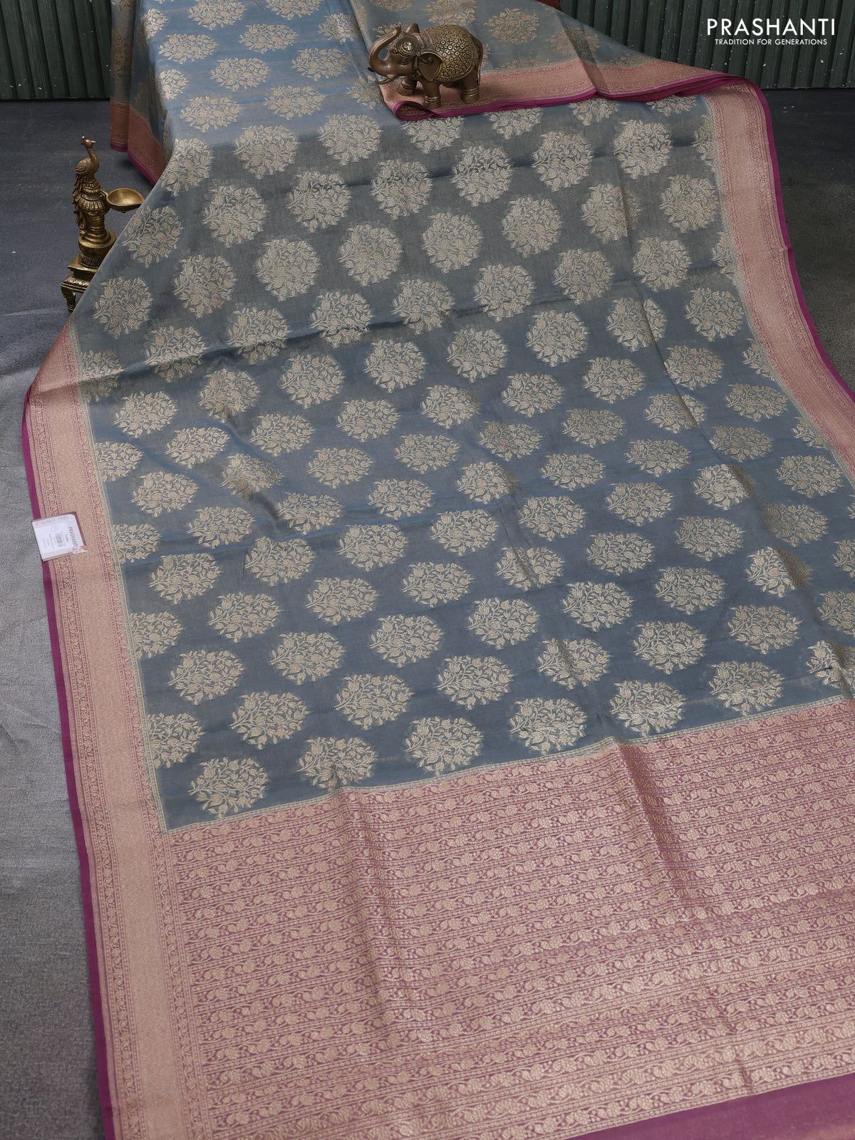 Banarasi tissue silk cotton saree grey and wine shade with allover thread & zari woven butta weaves and woven border