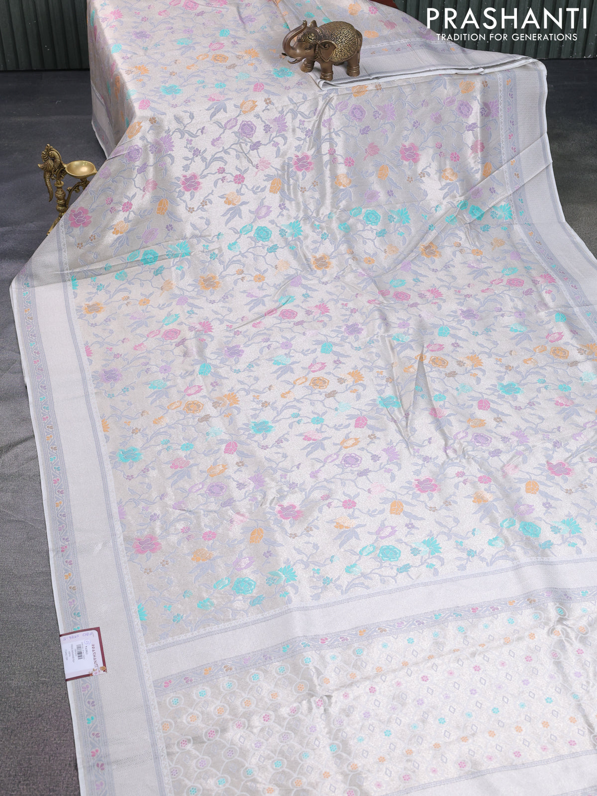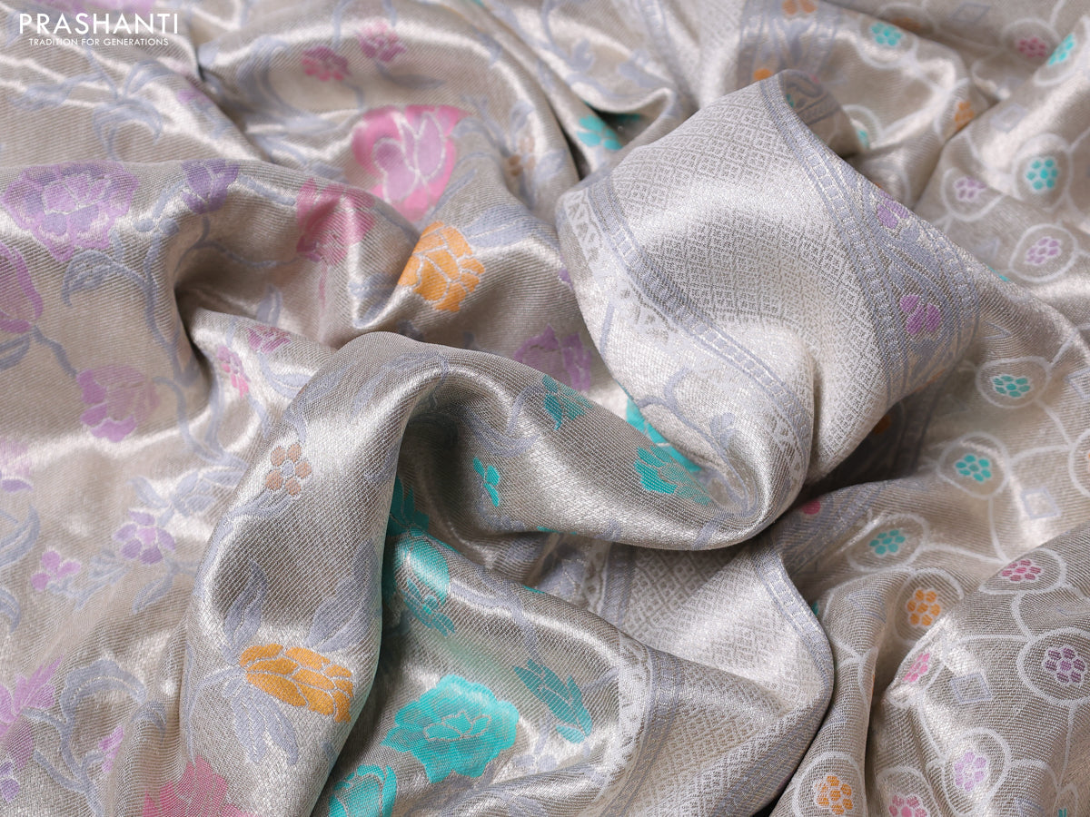 Banarasi tissue silk saree off white with allover thread woven floral weaves and silver zari woven border