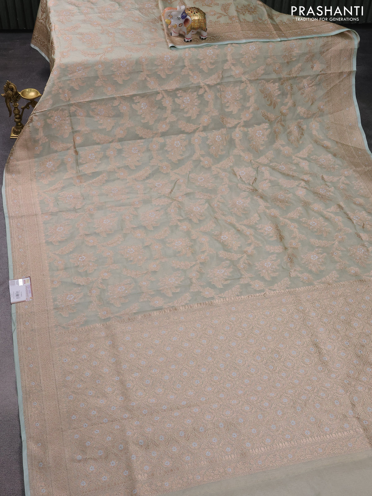Banarasi tissue silk saree pastel green with allover zari woven brocade weaves and zari woven border