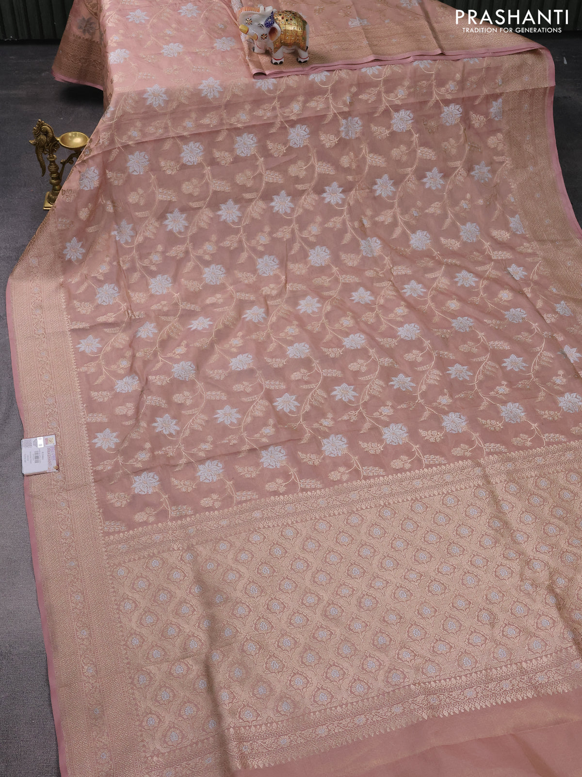 Banarasi tissue silk saree pastel peach with allover thread & zari woven floral weaves and zari woven border