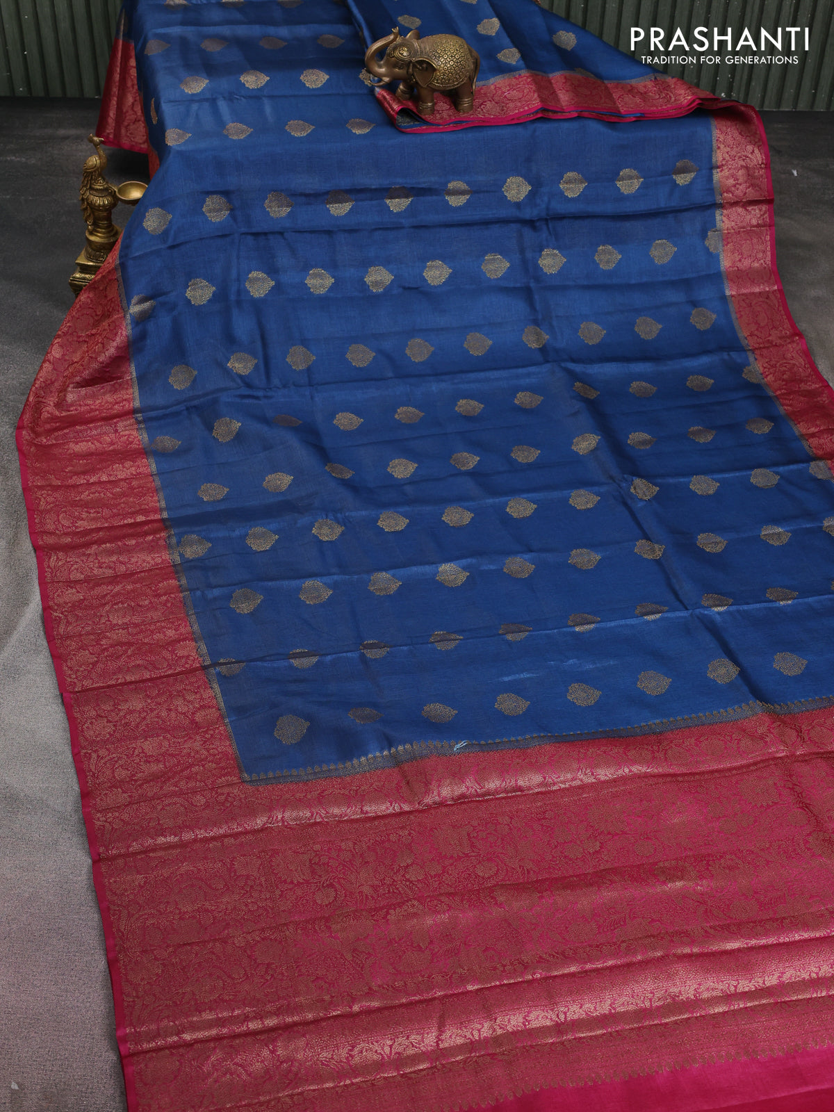 Banarasi tussar silk saree peacock blue and magenta pink with thread & zari woven buttas and woven border