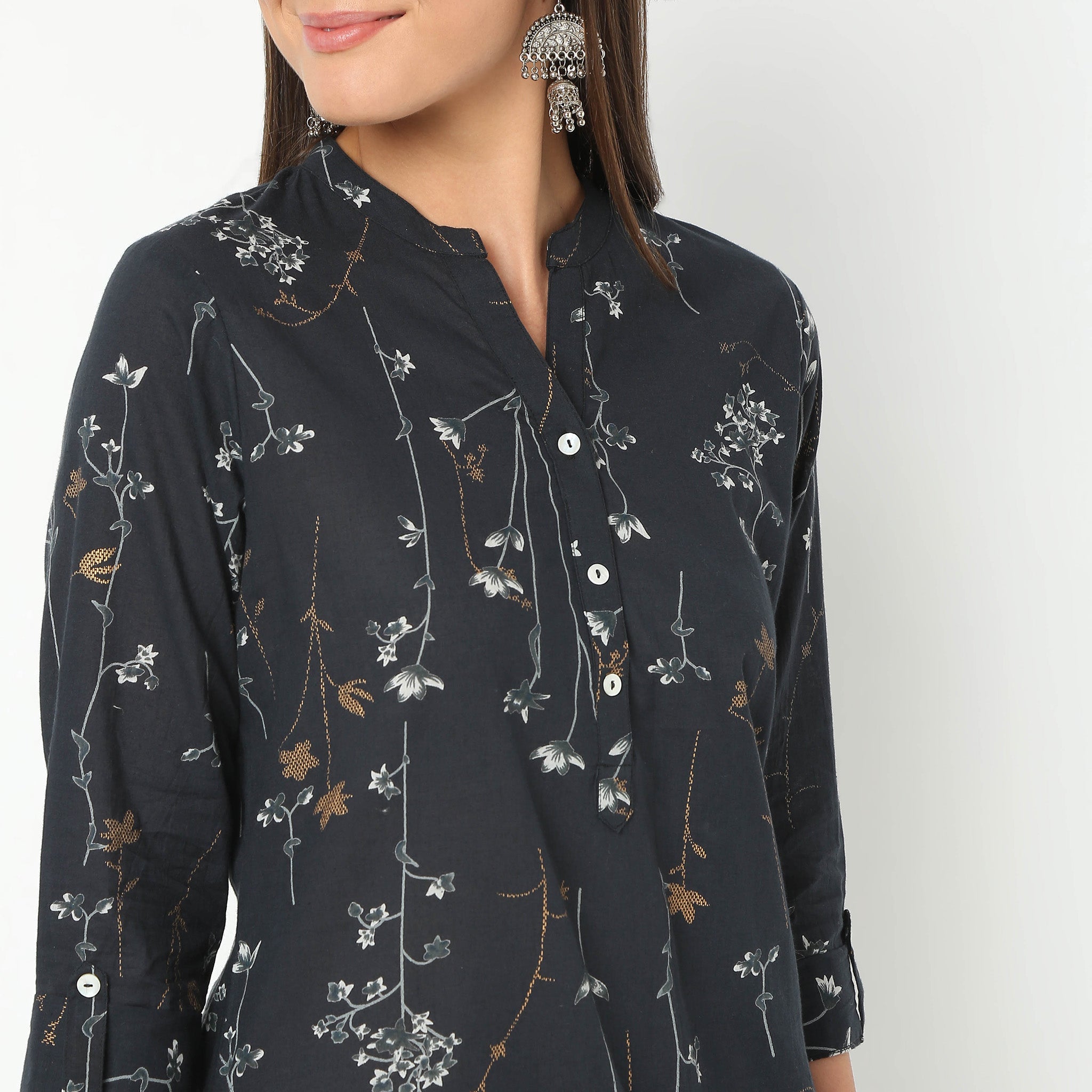 Band Neck Three-Fourth Sleeve Printed Straight Fit Short Kurta