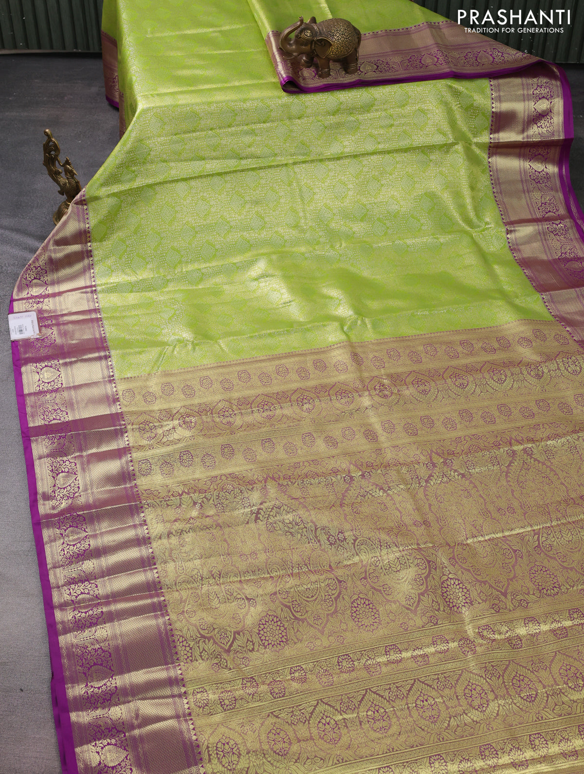Bangalori tissue silk saree light green and purple with allover silver zari woven brocade weaves and rich zari woven border