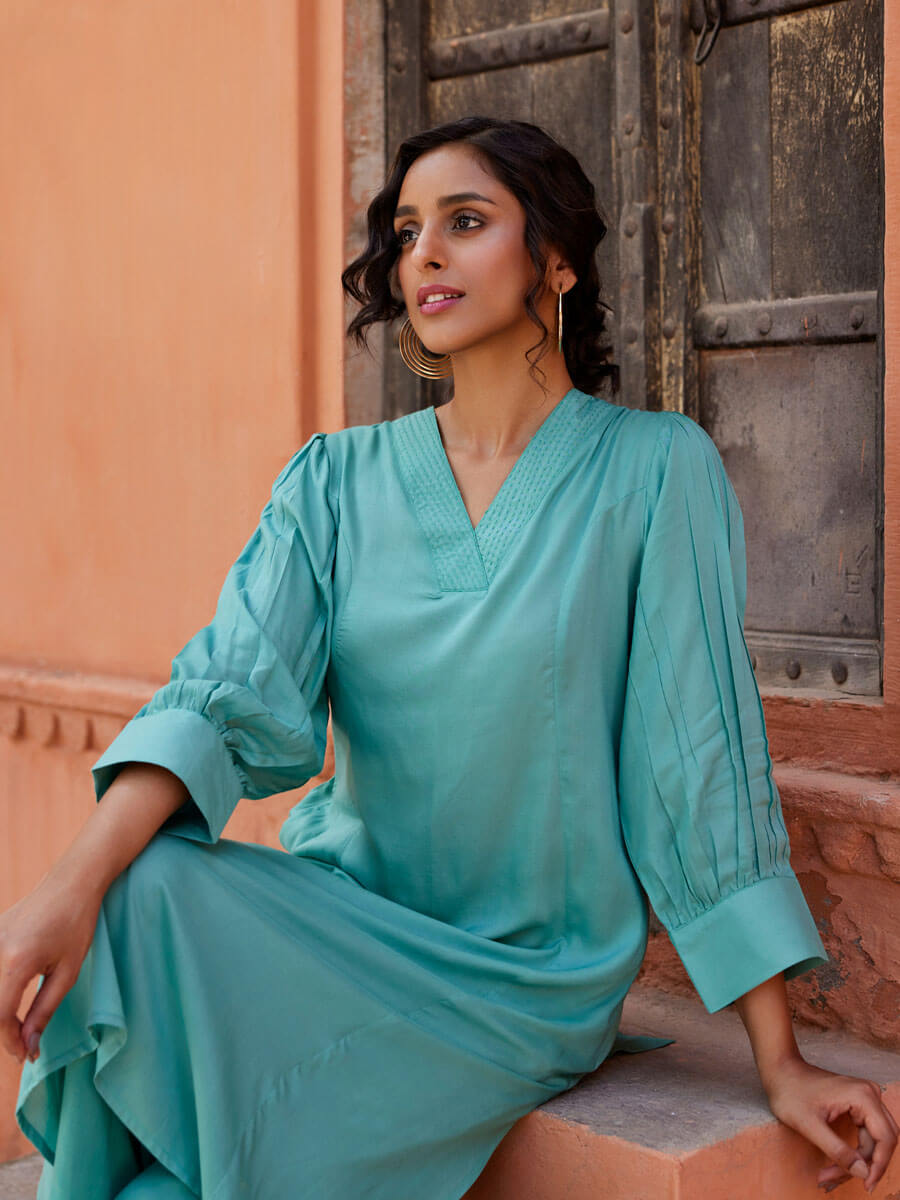 - Features: Panelled kurta with bishop sleeves and v-neckline