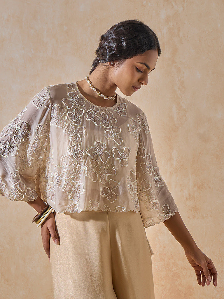 Bring ethereal designs to your ethnic capsule with this ivory top. Fashioned with a round neckline, this sheer top is designed with three-quarter flared sleeves with scalloped details. Encrusted with delicate floral beadwork, this lightweight style comes finished with a keyhole detailing at the back fixed with a button fastening for added charm.