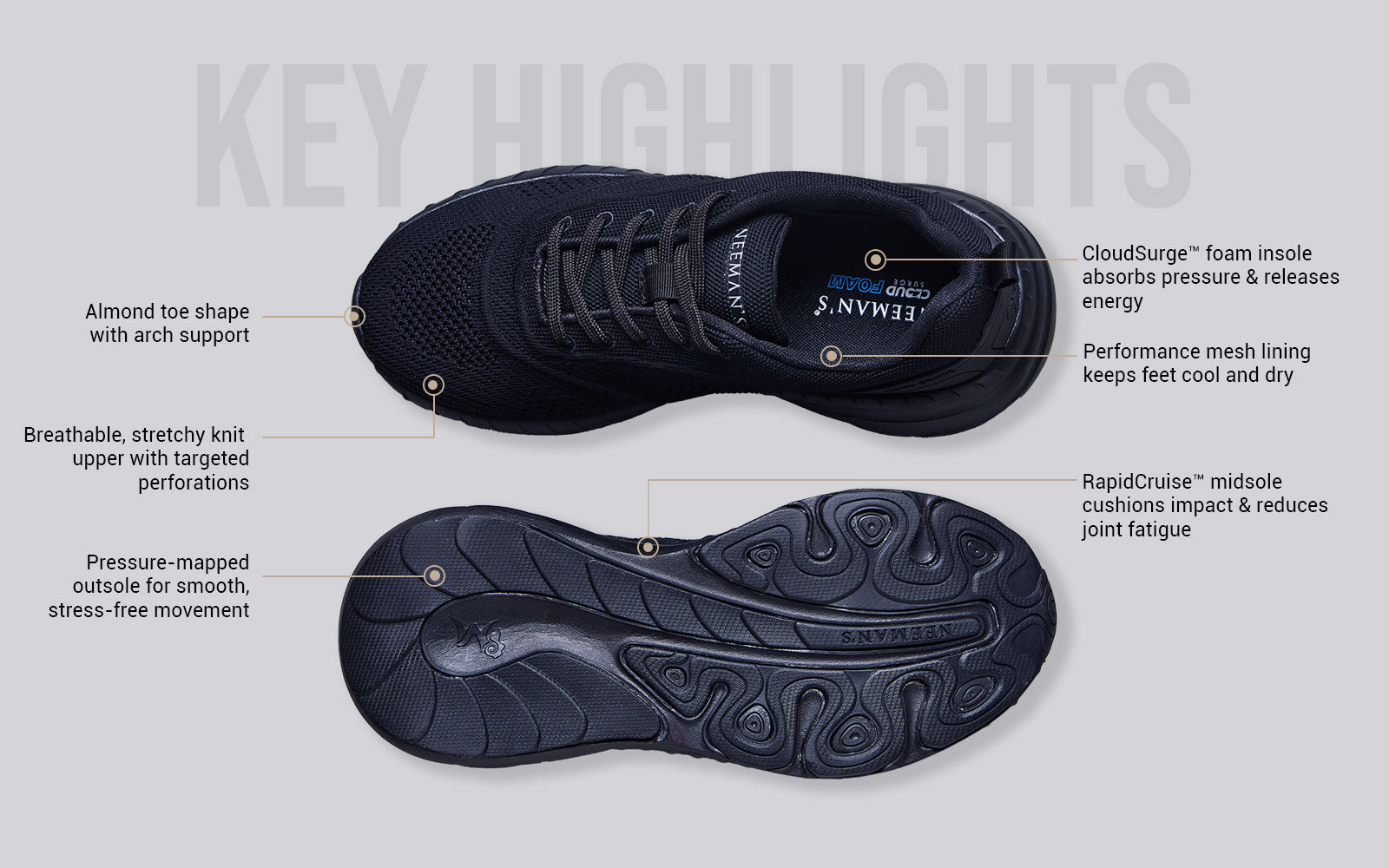 Expect a CloudSurge™ in your walking activity. Say hello to Begin Walk Flow. Engineered with RapidCruise™ midsole to cushion your landings, foam insole that absorbs pressure and releases energy, and a pressure-mapped outsole that keeps the stress off your joints, this pair is built to move. Add a 3D knit stretchable upper with extra perforations all around - suddenly, every step just… flows.