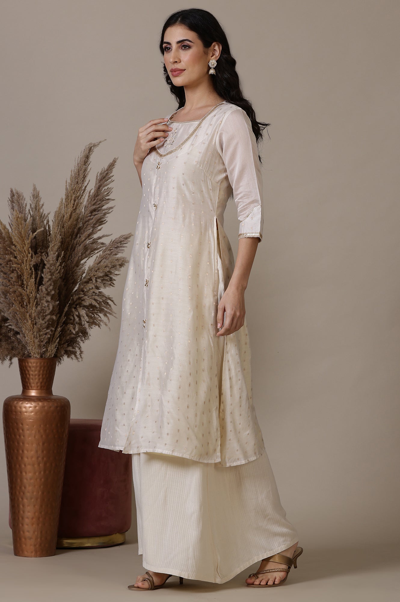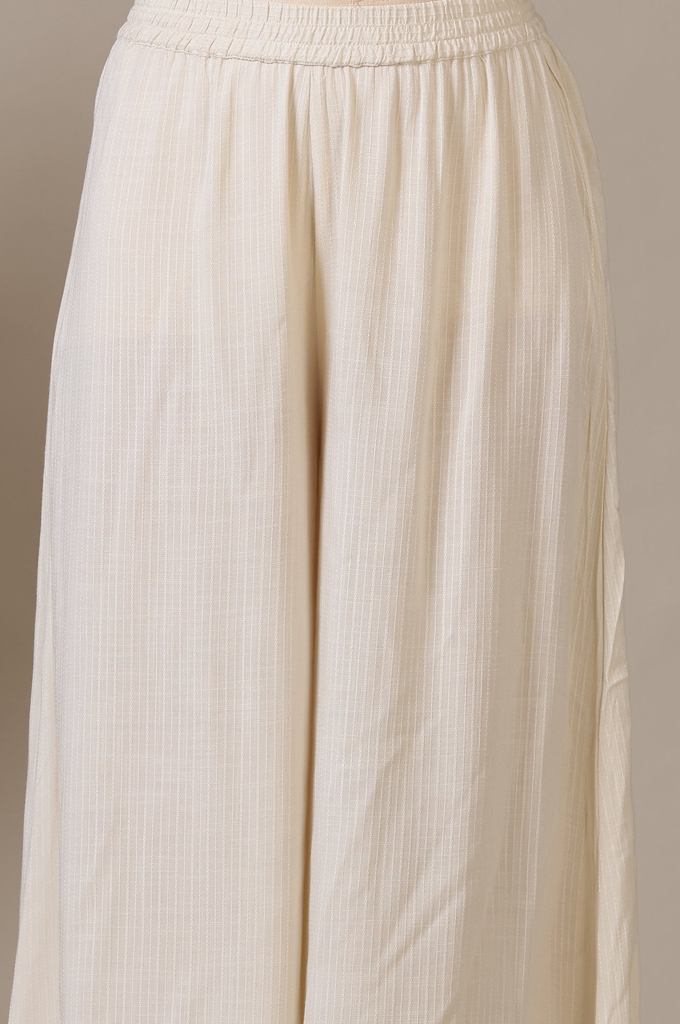 Beige A-line Jacquard Kurta, Palazzos and Dupatta Set